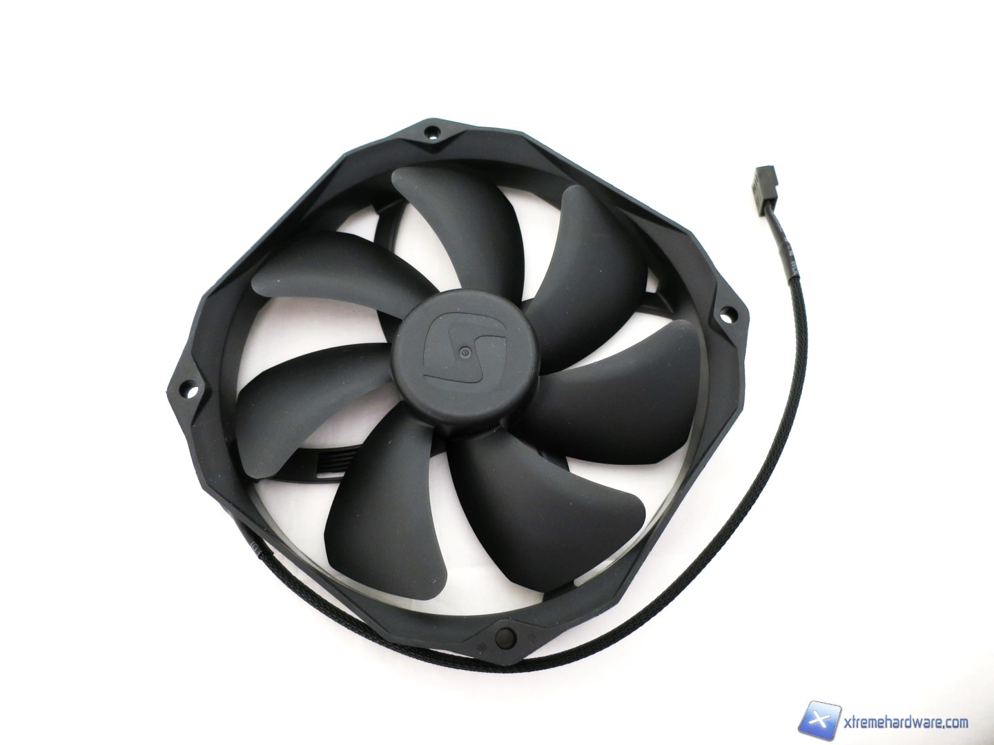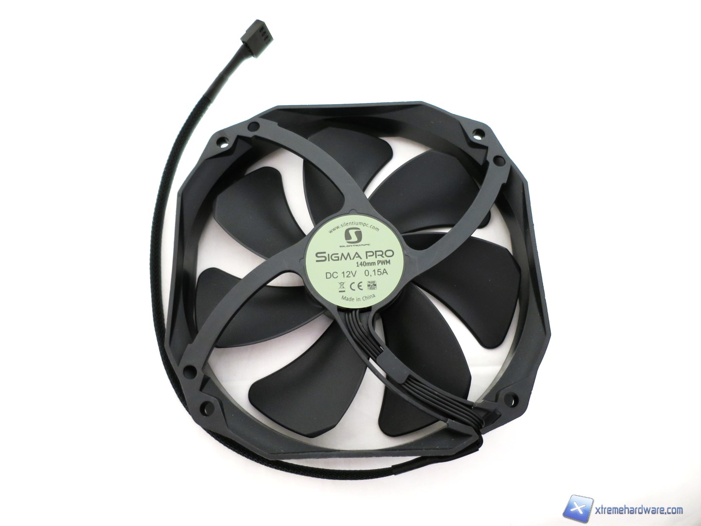 Come detto, nel bundle del SilentiumPC Fortis 3 HE1425 viene fornita anche una ventola da 140mm modello Sigma PRO PWM. La stessa ventola è disponibile anche singolarmente a catalogo di SilentiumPC in versione PWM e non. La Sigma PRO è una ventola con design classico in colorazione totalmente nera che si abbinerà ottimamente al Fortis 3 HE1425. E’ dotata di 7 pale dalla forma smussata. La stessa SilentiumPC conferma che si tratta di una ventola bilanciata nel rapporto Rumorosità/Prestazioni. I dati dichiarati infatti fanno segnare una velocità massima di 1400RPM con dBA massimi di circa 22 dunque abbastanza silenziosa. Come controparte di questi dati vengono in aiuto un valore di circa 78CFM che sono adeguati alle dimensioni e struttura di tale dissipatore. La ventola ha un frame semicircolare e nel modello standard viene fornita e dotata di un duplice set di montaggio che potrà rendere la stessa impiegabile in griglie da 120 o 140mm. Infine non manca un sistema di rotazione HSB / Hydraulic che ridurrà l’attrito a favore di una più bassa rumorosità e di un più lungo ciclo di vita. Il connettore è a 4 Pin PWM e il cavo è rivestito in treccia di tessuto.