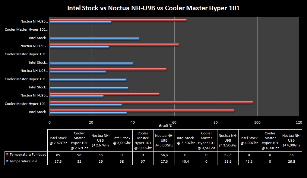 Come si può vedere dal grafico sovrastante il Cooler Master Hyper 101 non è un dissipatore per overclock spinti. Le sue due heat-pipes non riescono in nessun modo a raffreddare i bollenti spiriti del Core i5, nemmeno alla frequenza di default. Alla frequenza di 3.50 Ghz la piattaforma non riesce a fare il boot, obbligandoci a farla partire col secondo bios ausiliario.