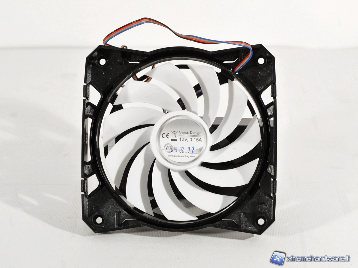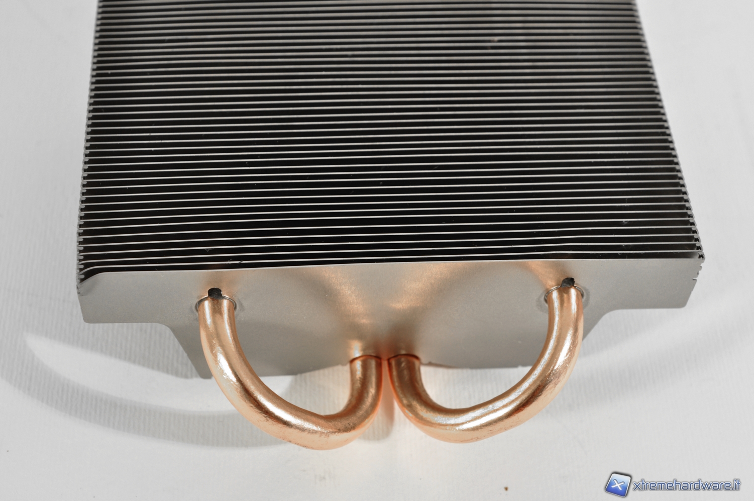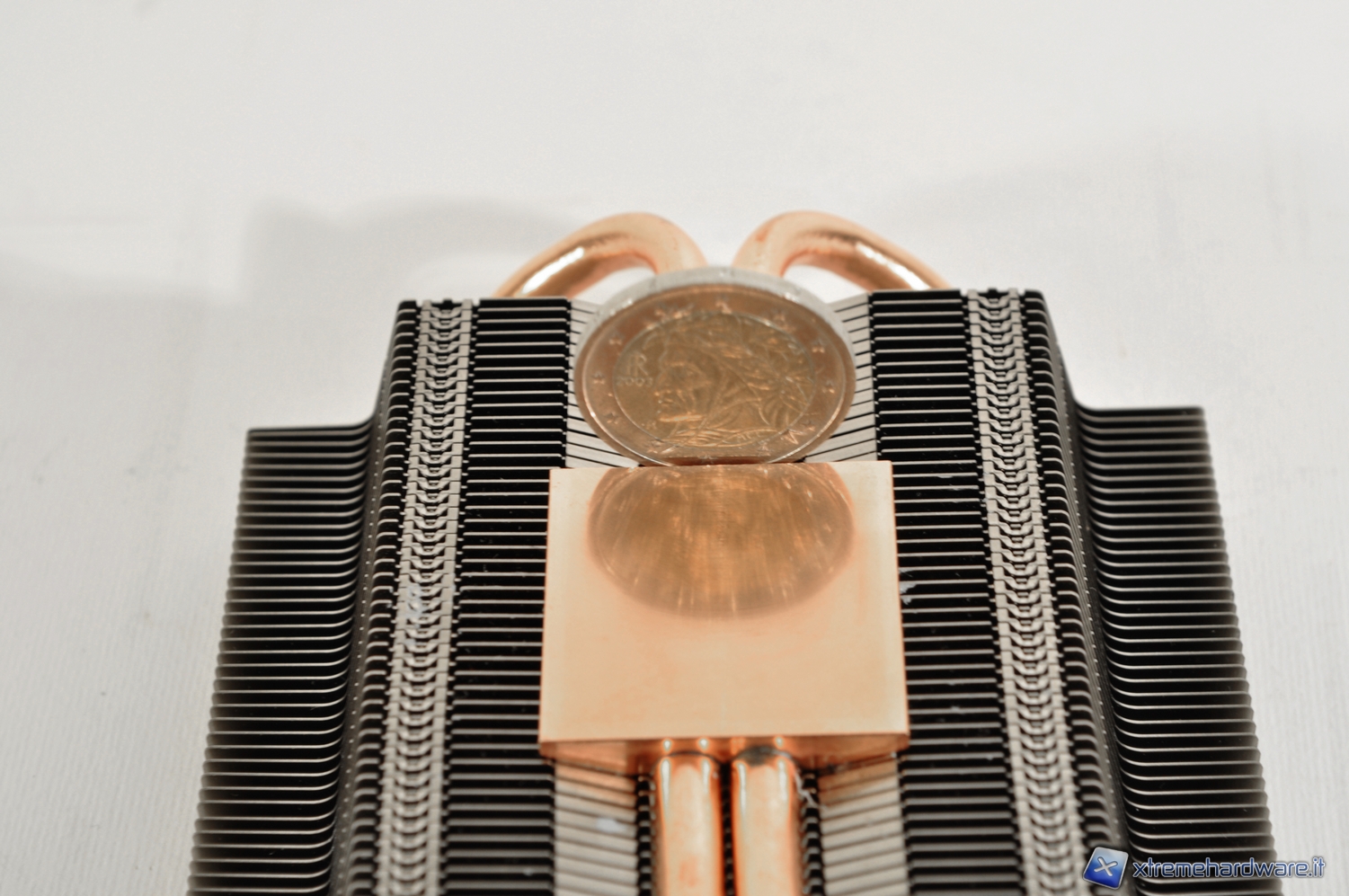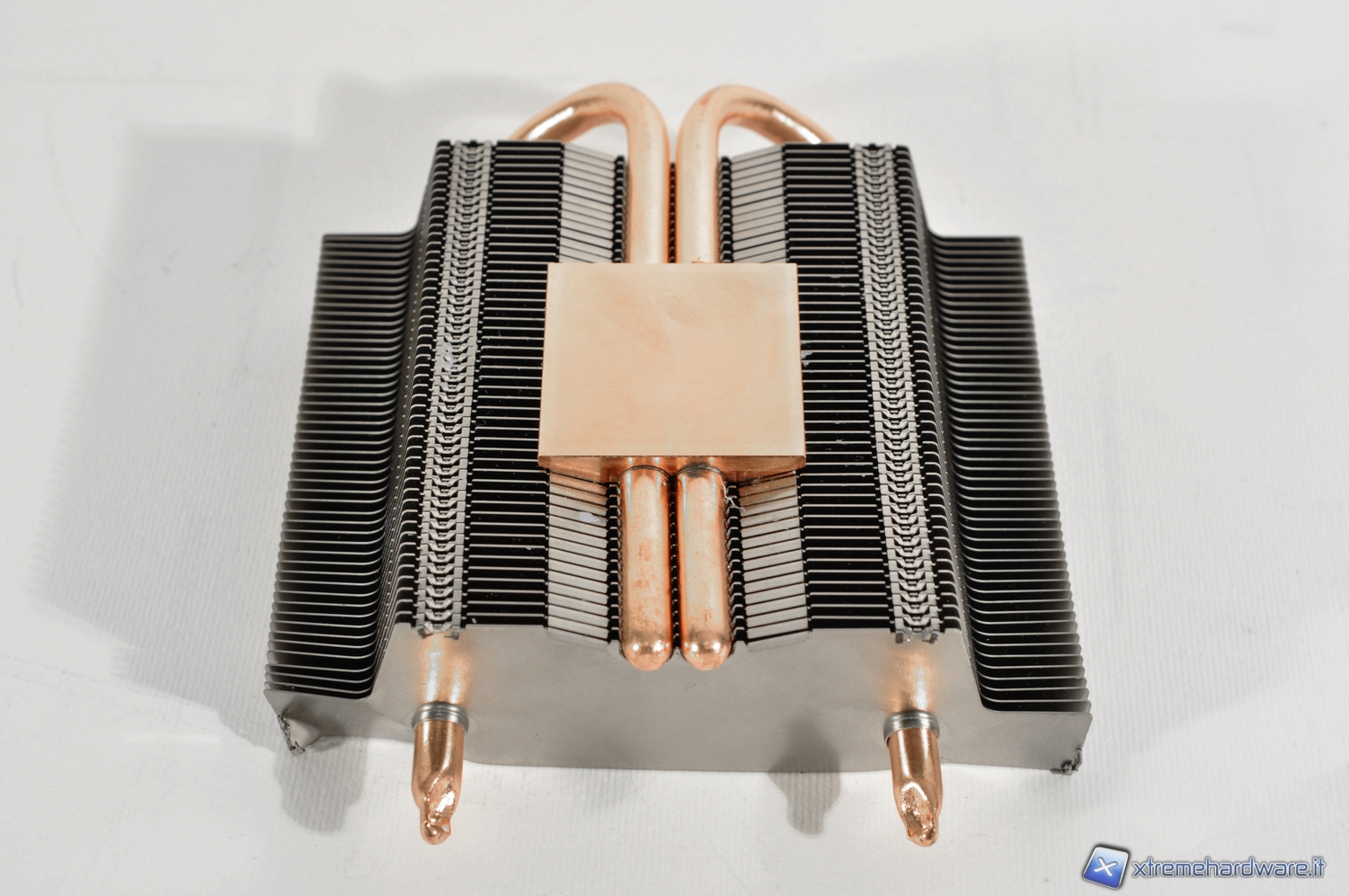 Il dissipatore è dotato di 2 heatpipes in rame che si collegano alla base sottostante del dissipatore. Quest’ultima è di dimensioni ridotte dal momento che il calore che il dissipatore può smaltire è piuttosto esiguo. La base, in rame, inoltre presenta una discreta lappatura che permette un miglior scambio del calore fra la cpu e la base dissipante. La pasta termo conduttiva applicata da Arctic Cooling sulla base del dissi è la ARCTIC MX-2.