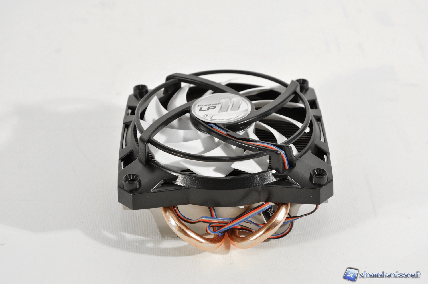 Il dissipatore Freezer LP 11 è un dissipatore orizzontale e la sigla “LP” del nome sta a significare “Low Profile”, cioè basso profilo. La sua altezza infatti è di soli 53mm e le sue dimensioni di 115*106*53mm. Come si può notare il dissipatore è molto compatto e può essere installato in qualsiasi case HTPC senza nessun problema.  La ventola in dotazione ha un diametro di 92mm ed è caratterizzata da ben 11 pale di color bianco con una velocità di rotazione che varia dai 900 ai 2000rpm massimi. La sua portata d’aria risulta essere di soli 27CFM (46m3/h) con una rumorosità complessiva di 0.4 Sone, nettamente inferiore a quella generata dal dissipatore stock di Intel. La ventola infine presenta un connettore a 4pin che ci consente di sfruttare la tecnologia PWM per il controllo automatico della velocità in base alla temperatura raggiunta dalla cpu. Tuttavia nulla ci vieta di rimuovere il blocco contente la ventola e installare artigianalmente un’altra ventola da 92mm fissandola con 4 viti.