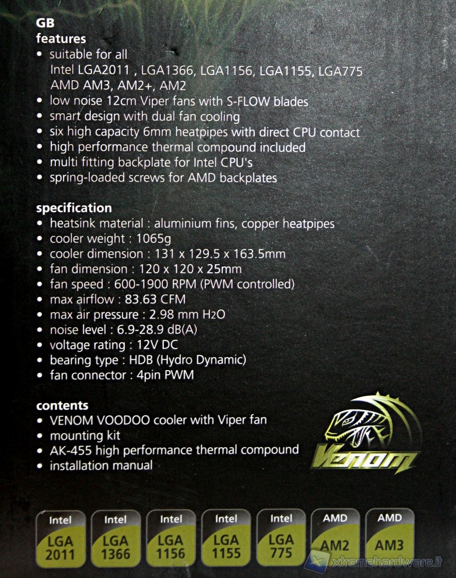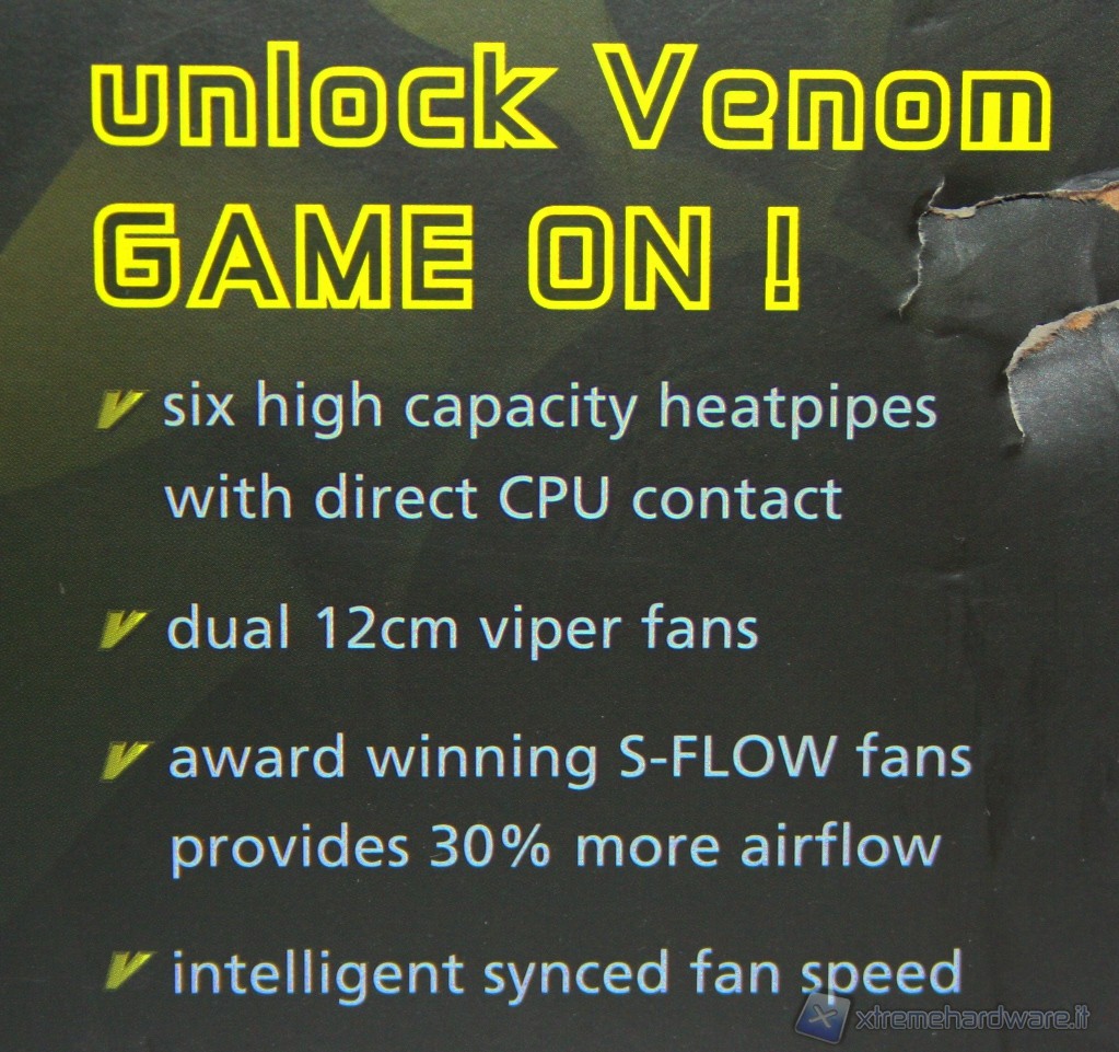 • H.D.T (Heatpipe Direct Touch): la base di contatto presenta le Heatpipes a diretto contatto con l’HIS della CPU e questo permettere di ottenere performance superiori, in linea teorica, rispetto al classico utilizzo derivante da una superficie lappata più o meno a specchio. Diversamente dalla precedente versione, la Vodoo, in questo caso sono presenti 6 heatpipes da 6mm invece che 4 da 8mm. E’ sempre presente un piccolo gap tra le Heatpipes stesse ma approfondiremo dopo la questione.