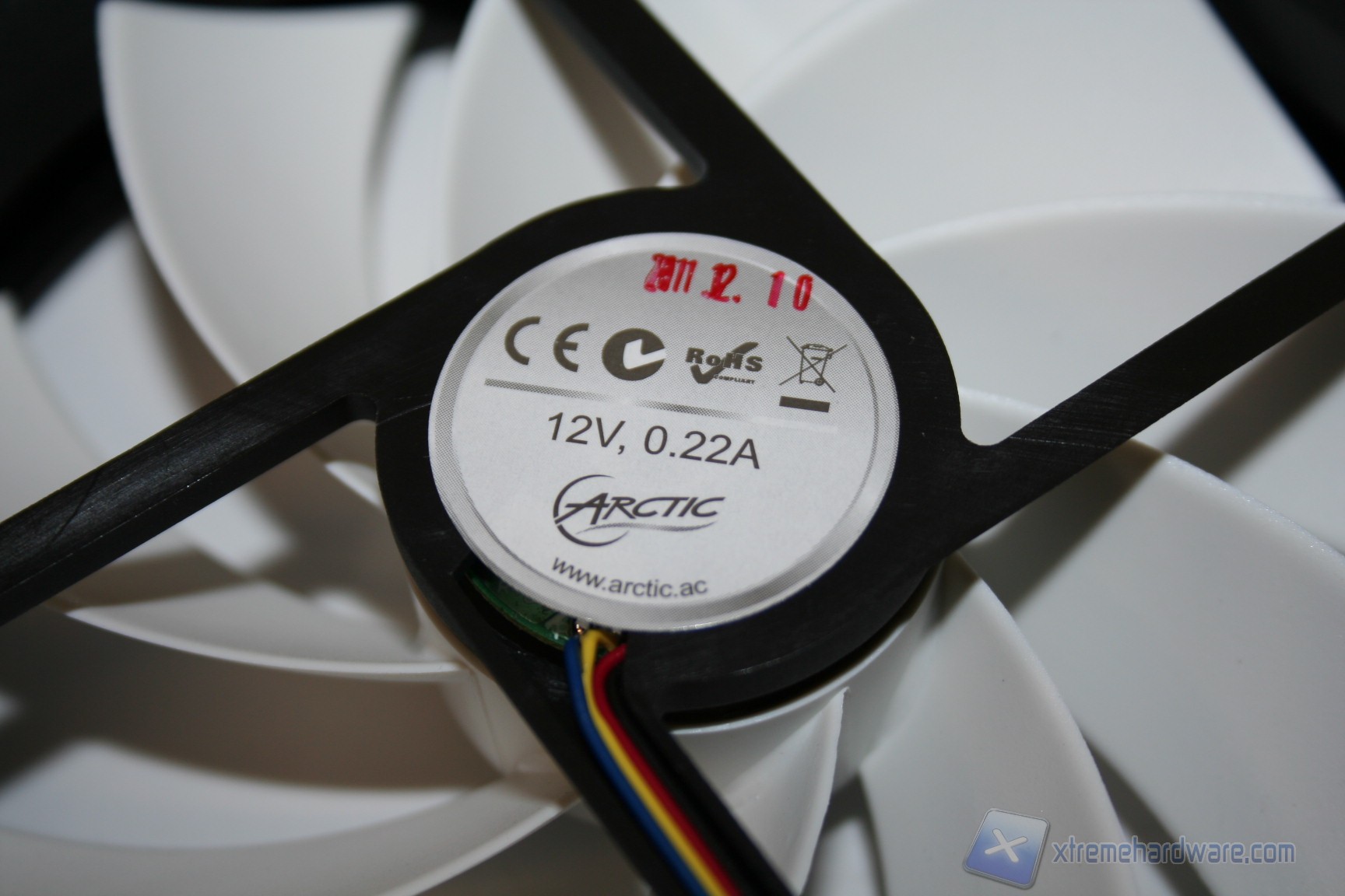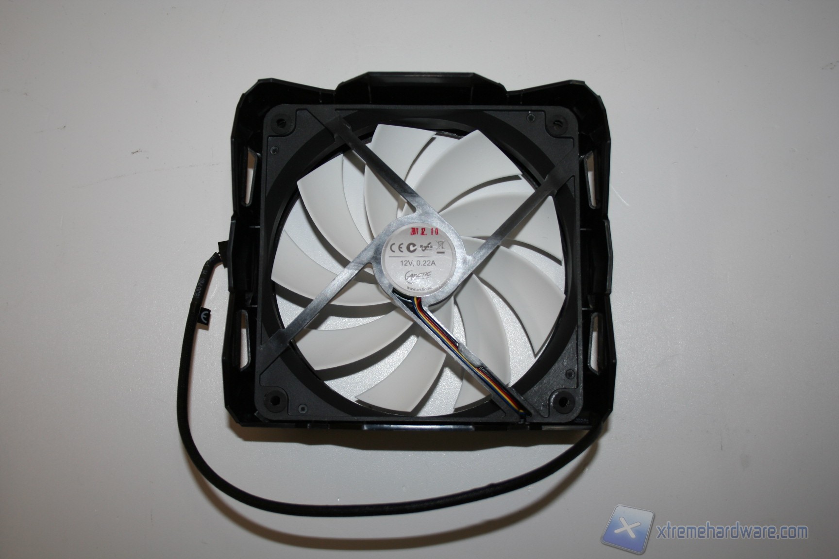 La ventola è costituita da 9 pale di colore bianco con il logo dell’azienda al centro della stessa ed incastonate in un frame di colore nero. La ventola dispone di un controller PWM, che permette di regolare la velocità di rotazione da 300 fino a 1350 RPM al minuto, con un intensità sonora massima di 0.3 sone, circa 22.5 decibel, e garantire un flusso d’aria massimo di ben 74 CFM. Specifichiamo che il regime di rotazione è regolato automaticamente dalla scheda madre tramite connettore PWM che lo aumenterà o diminuirà in base al carico a cui è sottoposto il processore ed in base alla sua temperatura.