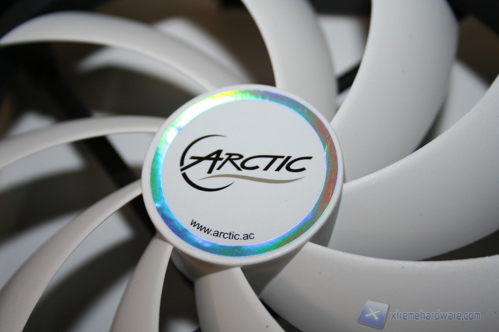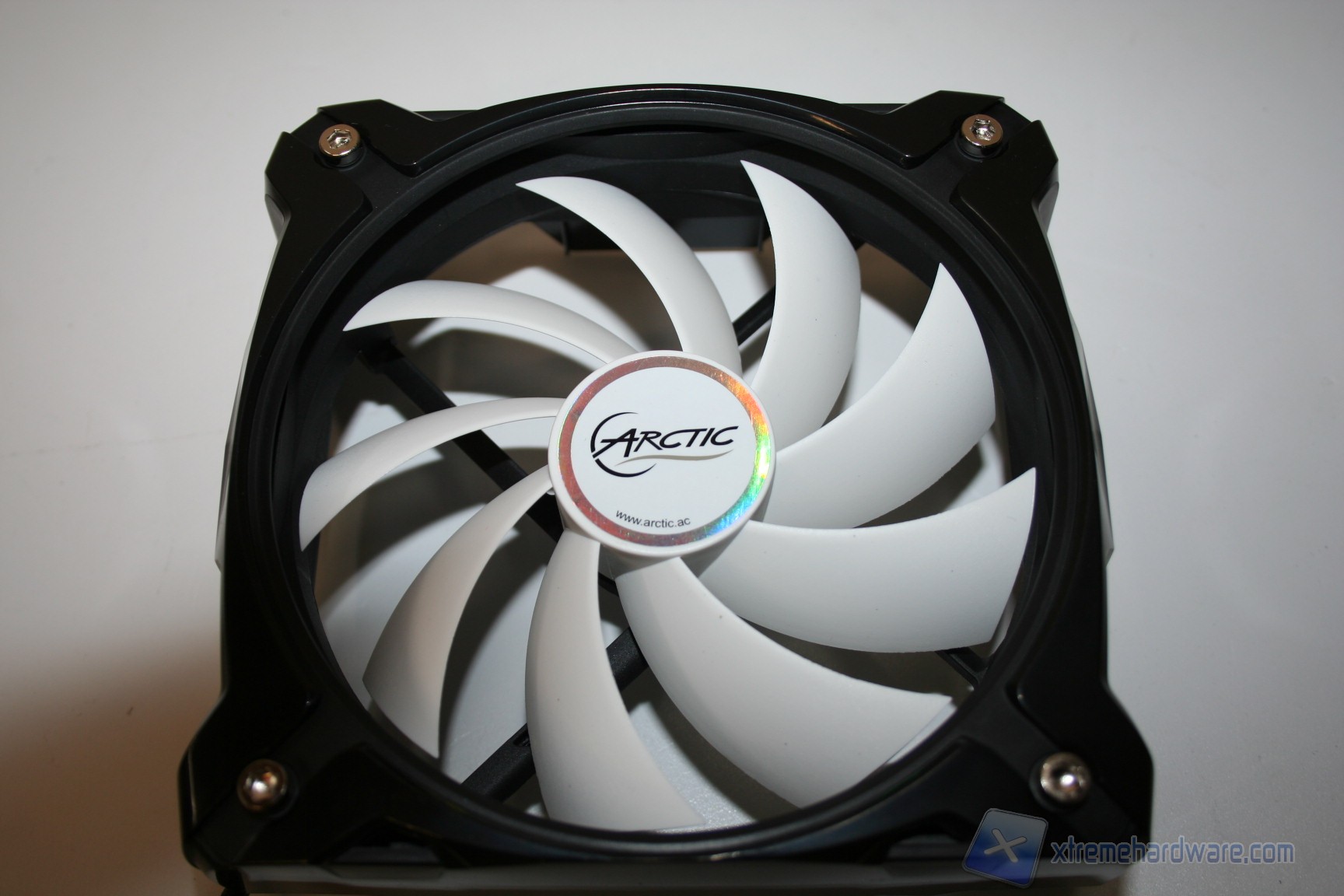 Con il Freezer i30 viene fornita in dotazione al bundle una ventola Arctic Cooling F12 da 120 mm PWM, sostituibile con un qualsiasi modello di pari dimensioni e con maggiori prestazioni. La ventola come possiamo notare è sostenuta da un frame in plastica rigida e da quattro viti-perno antivibrazione che la separano dal corpo del dissipatore. Il design della ventola F12 è molto sobrio, notiamo infatti un semplice contrasto bianco – nero.
