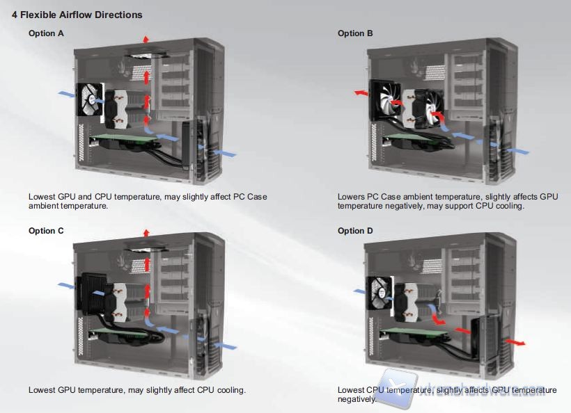 Arctic Cooling precisa che è possibile montare il dissipatore in quattro orientamenti, in base alle potenzialità del cabinet in esame: