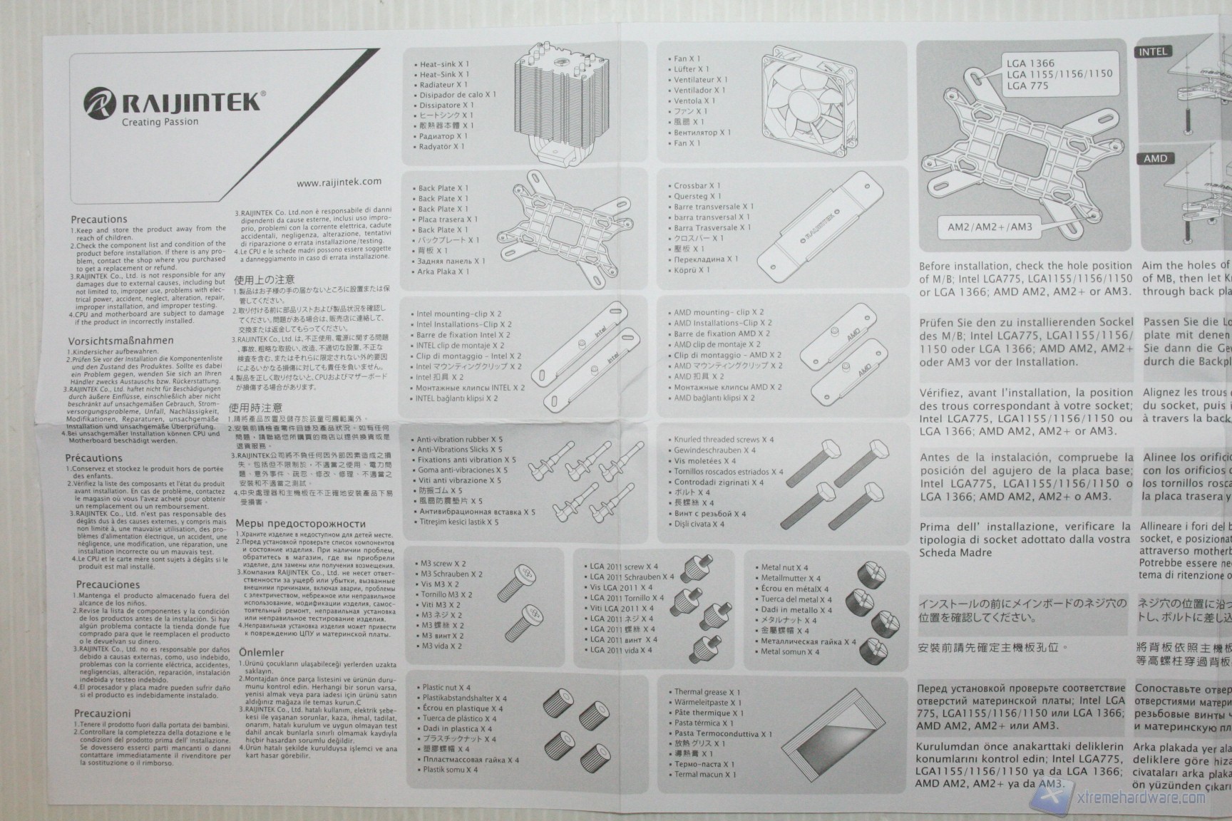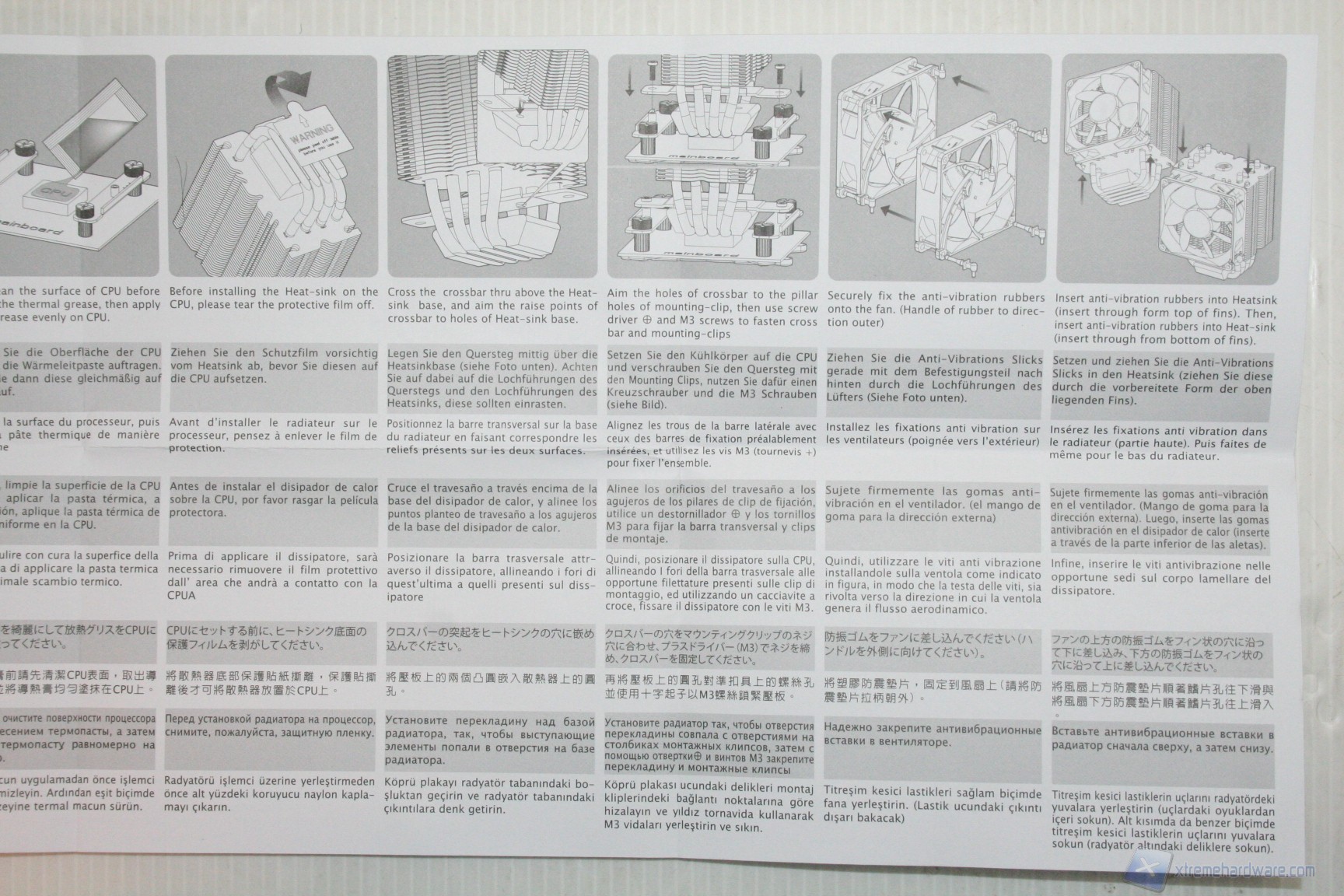 La confezione è economica, discreta e ridotta in dimensioni, nonostante che sia il dissipatore più grande tra quelli ricevuti. L’imballo è elementare, quindi vi invitiamo a controllare bene se ci fossero urti, prima dell’apertura del pacco; l’eventuale presenza di questi ultimi potrebbe indicare un danneggiamento del radiatore all’interno. L’utilizzo di fustellati in polietilene espanso (PET) avrebbe certamente permesso una protezione maggiore, ma è comprensibile dato il prezzo di acquisto ridicolmente basso. Il manuale non è altro che un foglietto informativo, che presenta una buona descrizione sia del contenuto che della procedura di montaggio.