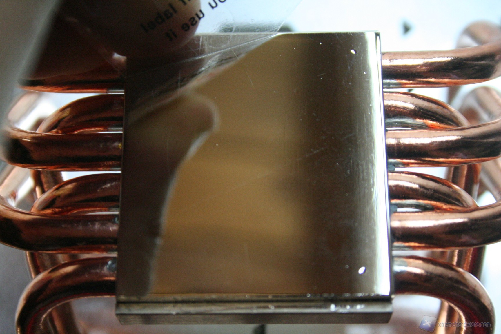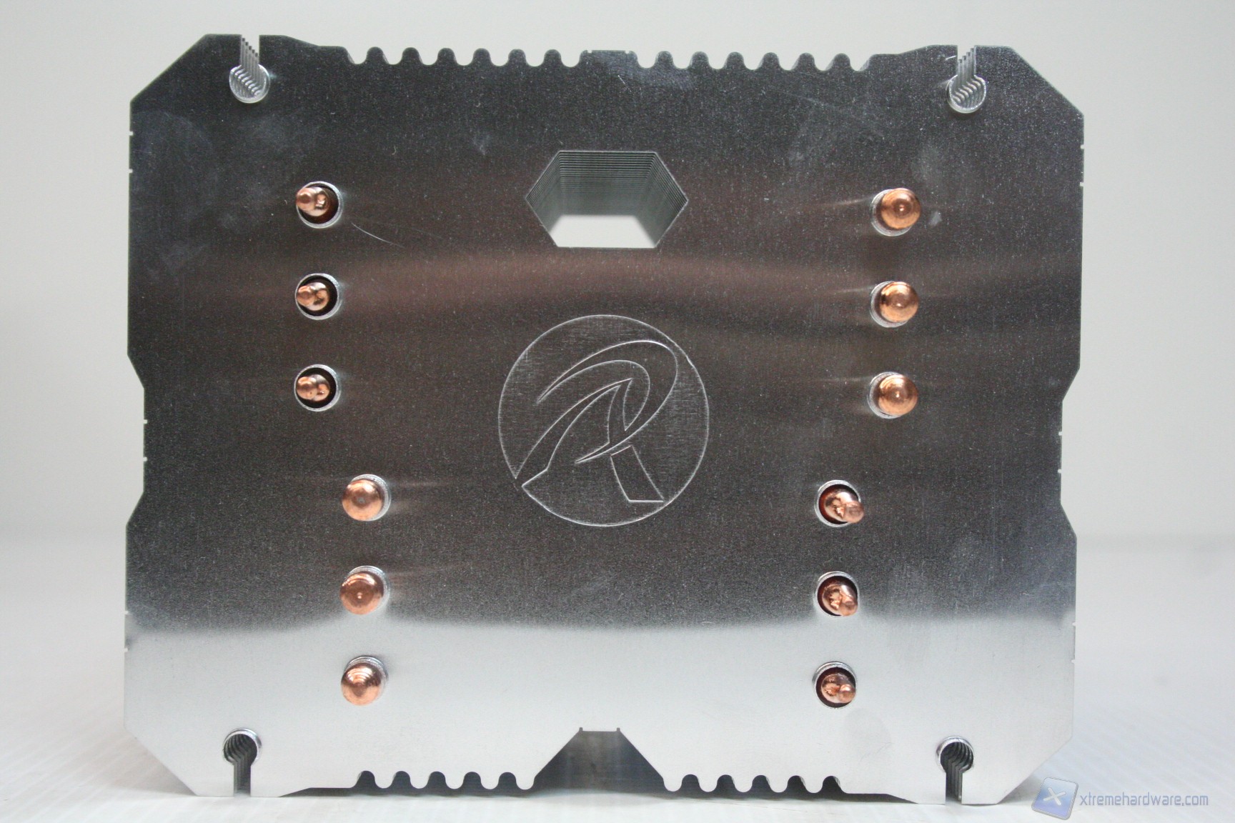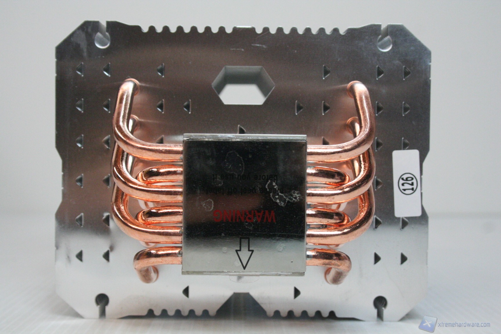La base è leggermente convessa, ma di ottima qualità: è lappata a specchio, non sono presenti segni di lavorazione al tornio e le saldature con le heatpipe sono evidenti, quindi è una buona notizia. La base convessa non è consigliabile sul socket LGA 2011, in quanto il problema della deformazione a “banana” del socket non è più presente, al contrario del sistema 1155-56/1366, dove invece un minimo di convessità è consigliata.