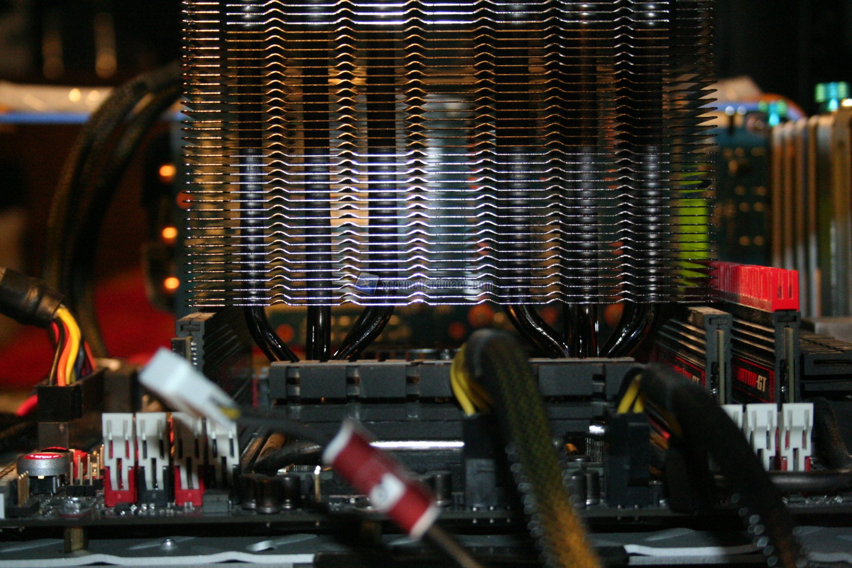 La compatibilità con RAM ad elevato profilo in linea teorica sarebbe ottima, se non fosse per un problema: la compatibilità con la Rampage IV Extreme. Dato che una coppia laterale di heatpipes collide con il dissipatore passivo della sottosezione VRM della motherboard, è stato necessario posizionare il dissipatore lateralmente, il che quindi comporta dei problemi con le RAM ad elevato profilo.