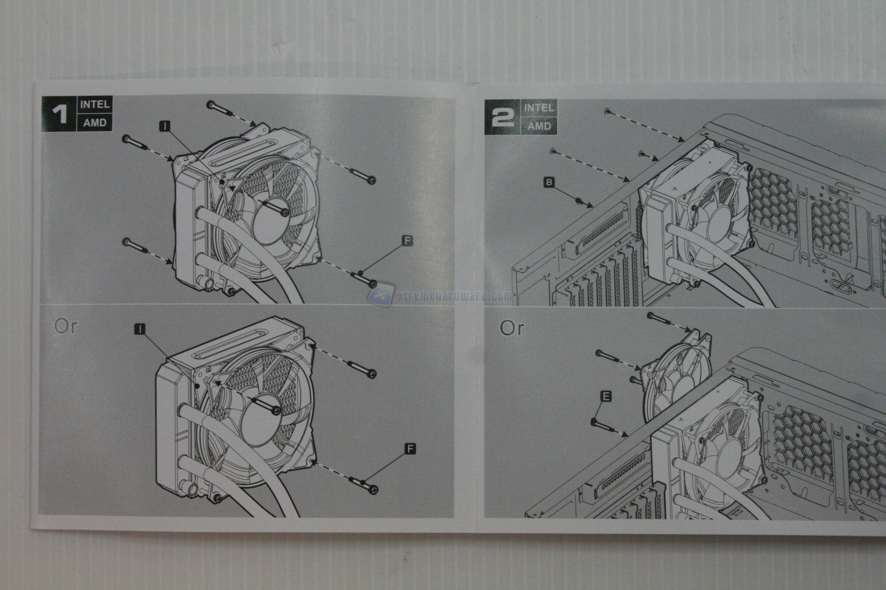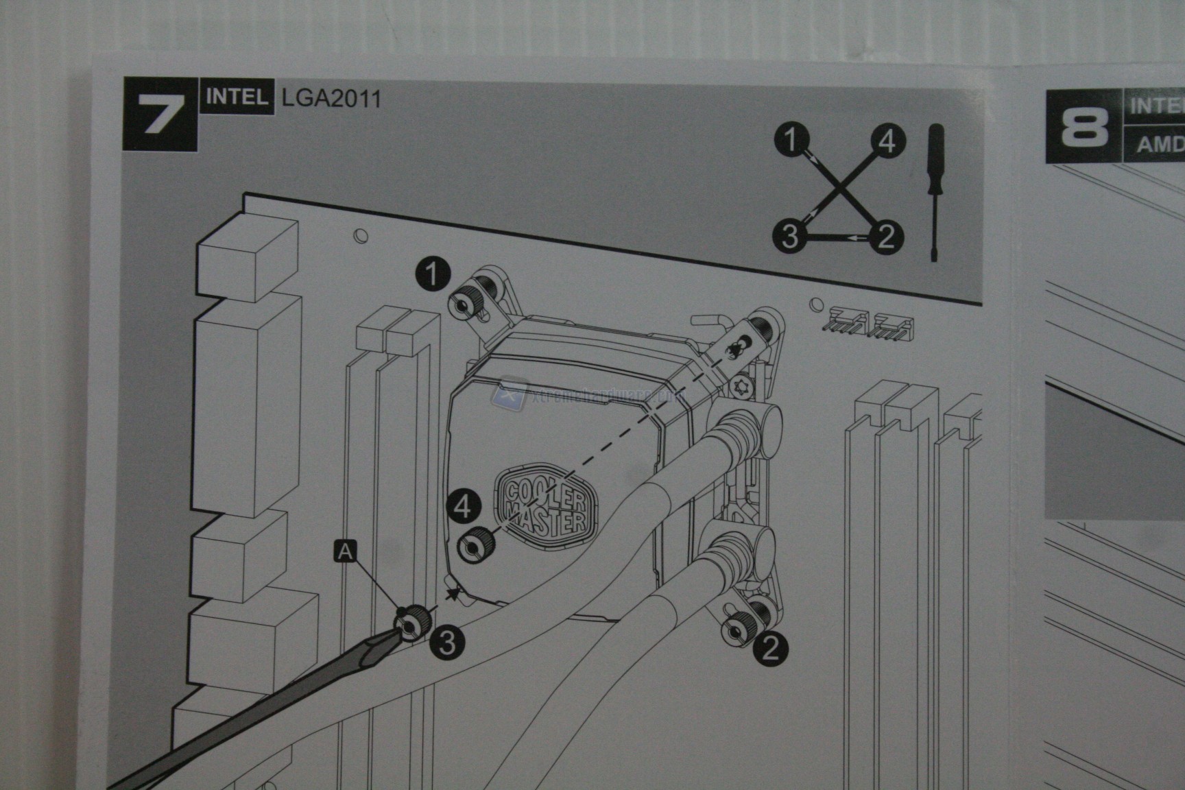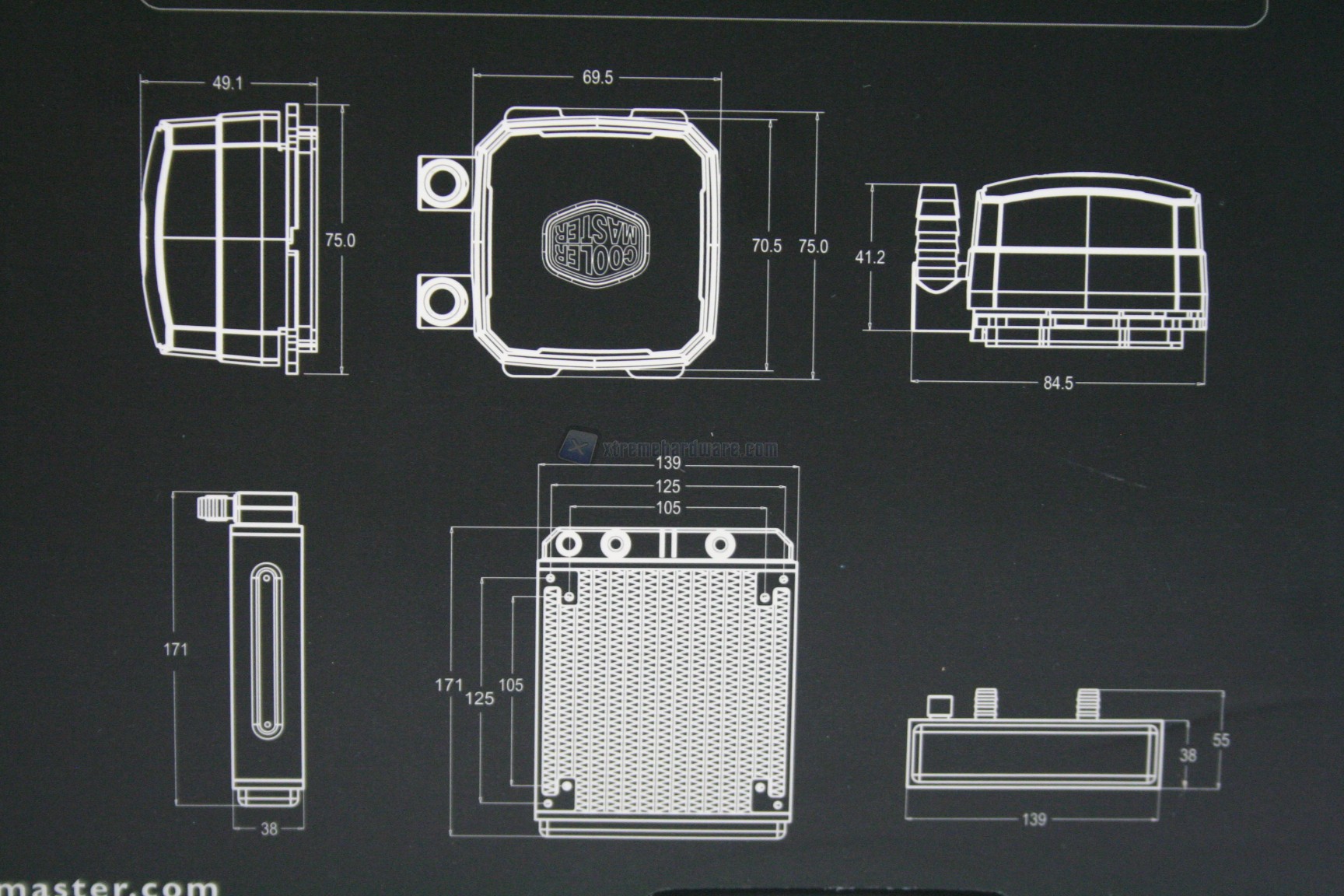 Il dissipatore è inserito all’interno di una classica, e notevole, confezione Cooler Master. Il quantitativo di informazioni è elevato e l’imballo decisamente valido, data anche la confezione di generose dimensioni. Il confezionamento interno è derivante da sostanze riciclate, similmente a soluzioni della concorrenza e similmente ai prodotti immessi da CoolIt ed Asetek. Ciò rende possibile ovviare in parte ai seri problemi derivanti dagli imballi di prodotti informatici, che per la loro natura inquinante sono problematici nello smaltimento. Una volta aperta la confezione però è presente un sottile strato di polietilene espanso (PET). La scatola, di forma rettangolare, è molto rigida, ed all’esterno vengono riportate le tolleranze laterali e i dettagli dimensionali, aspetto interessante dato che non è prassi comune. Il manuale in dotazione, altro non è che un gigantesco foglio con i dettagli di installazione. Avremmo gradito un manuale classico ma per ragioni di costo probabilmente non si è scelto di optare per tale soluzione; comunque sia è curato e adatto allo scopo.