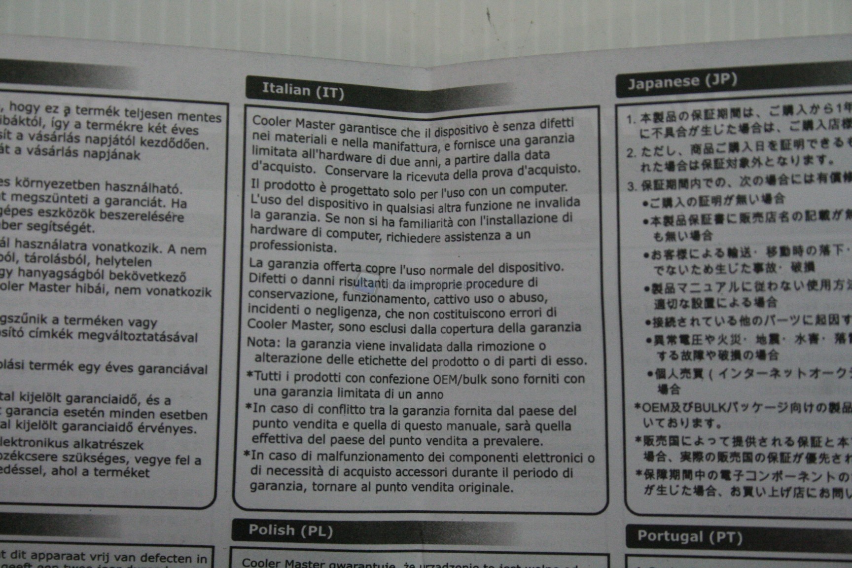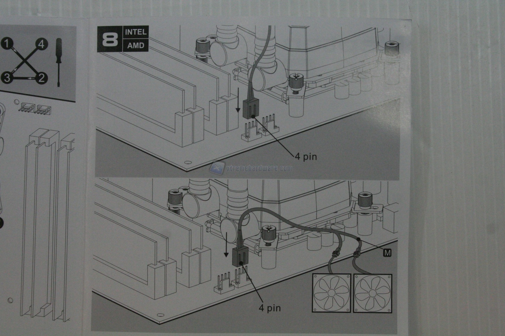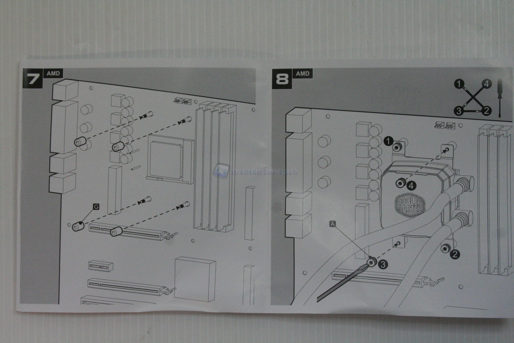 Il dissipatore è inserito all’interno di una classica, e notevole, confezione Cooler Master. Il quantitativo di informazioni è elevato e l’imballo decisamente valido, data anche la confezione di generose dimensioni. Il confezionamento interno è derivante da sostanze riciclate, similmente a soluzioni della concorrenza e similmente ai prodotti immessi da CoolIt ed Asetek. Ciò rende possibile ovviare in parte ai seri problemi derivanti dagli imballi di prodotti informatici, che per la loro natura inquinante sono problematici nello smaltimento. Una volta aperta la confezione però è presente un sottile strato di polietilene espanso (PET). La scatola, di forma rettangolare, è molto rigida, ed all’esterno vengono riportate le tolleranze laterali e i dettagli dimensionali, aspetto interessante dato che non è prassi comune. Il manuale in dotazione, altro non è che un gigantesco foglio con i dettagli di installazione. Avremmo gradito un manuale classico ma per ragioni di costo probabilmente non si è scelto di optare per tale soluzione; comunque sia è curato e adatto allo scopo.