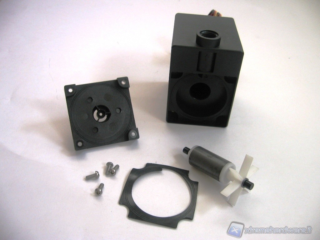Le uniche parti rimovibili per le periodiche operazioni di pulizia, sono quelle mostrate in foto. L’asse centrale sul quale gira l’elica è di tipo ceramico ad alta resistenza all’usura tenuto fermo da due terminali in gomma. Il cilindro in plastica è rivestito di materiale magnetico e provvede a trasmettere il moto all’elica, grazie alla forza induttiva generata dal campo magnetico rotante. La guarnizione provvede a tenere chiusa ermeticamente la camera.