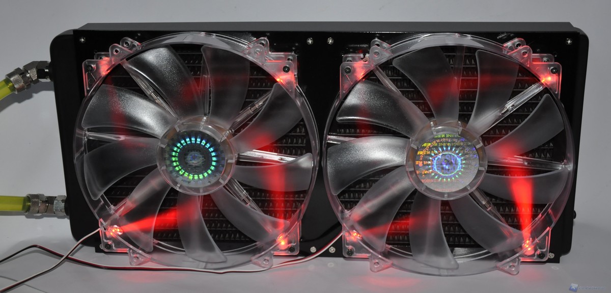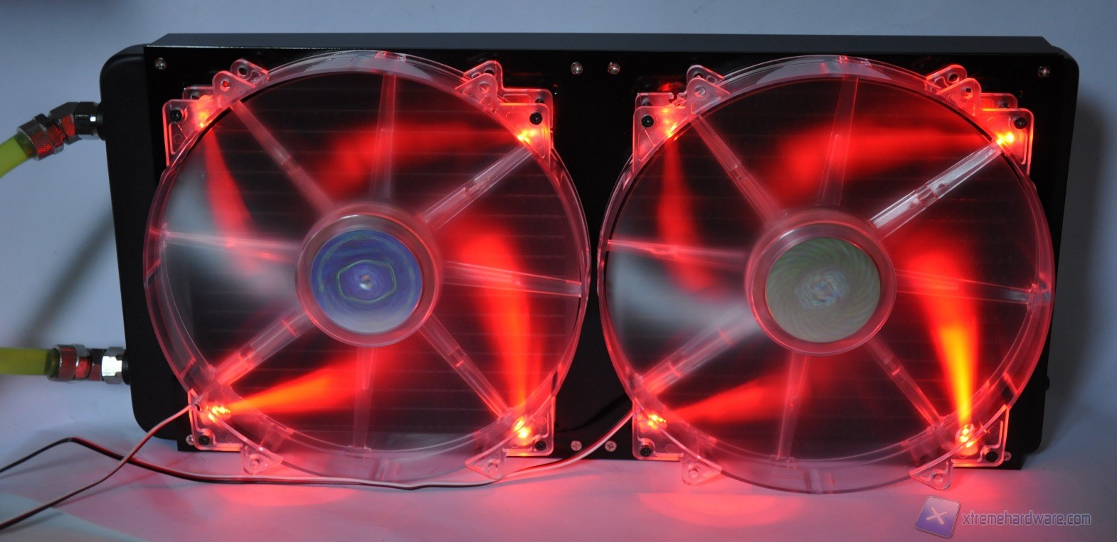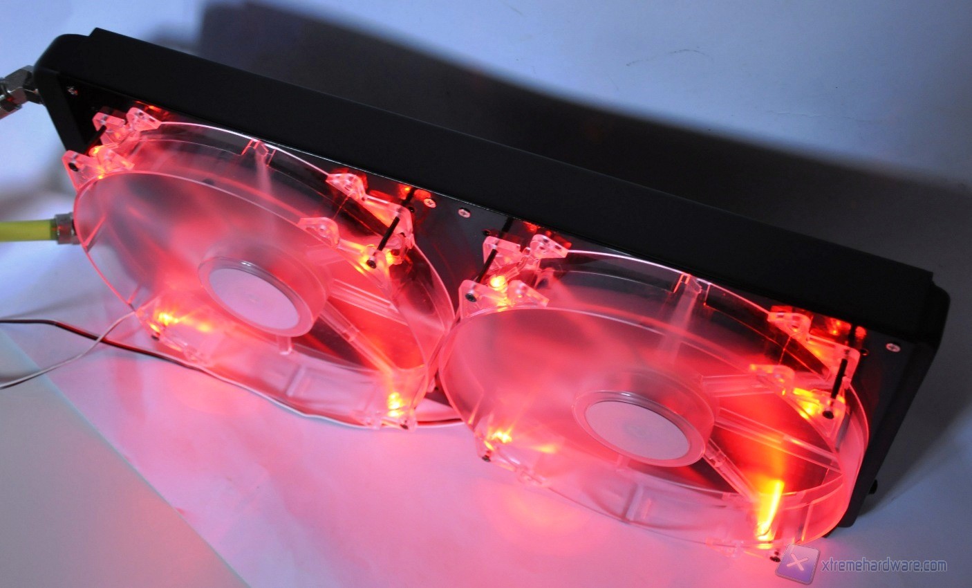 Le ventole scelte per i test sono quelle della Coolermaster che hanno in dotazione i led rossi (ma sono presenti in vendita anche con led blu) e creano un piacevole effetto ottico che risalta maggiormente nella foto di destra scattata senza il flash. Dalle specifiche tecniche il range di compatibilità del radiatore nella scelta delle ventole è molto ampio, si possono difatti utilizzare anche ventole di diametro da 180mm.