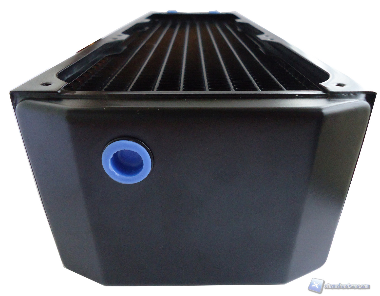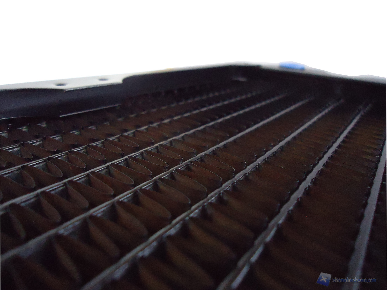 La densità delle lamelle è pari a 11 FPI (fins per inch) e come detto in precedenza sono presenti su ogni lato 12 filettature M3 per permettere l’installazione di 3 ventole per ogni lato per un totale di 6 in un’eventuale configurazione push-pull. In questa configurazione il radiatore raggiunge lo spessore di ben 130mm: riuscire ad installarlo all’interno di un cabinet è tutt’altro che banale. Noi ci “limiteremo” a testarlo in configurazione push, in uno dei pochi cabinet in grado di accoglierlo.