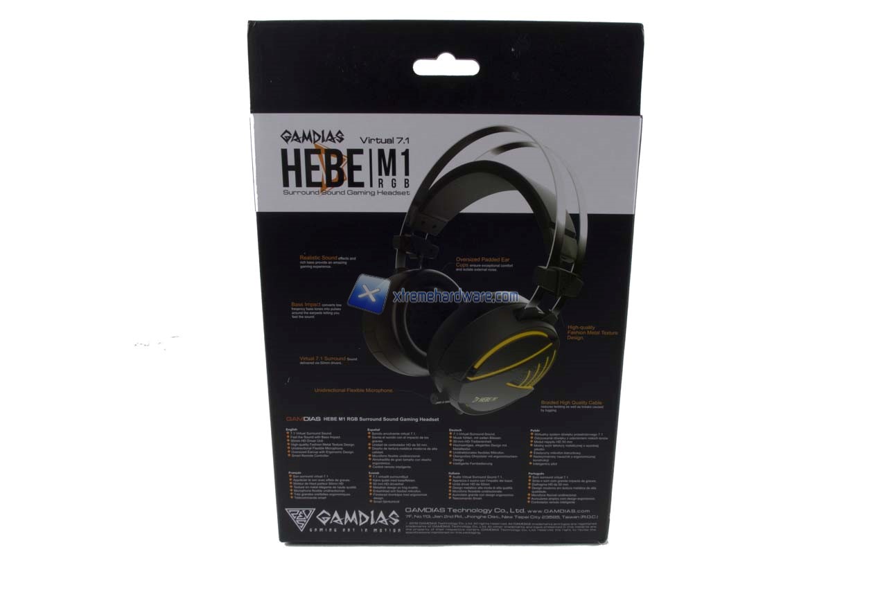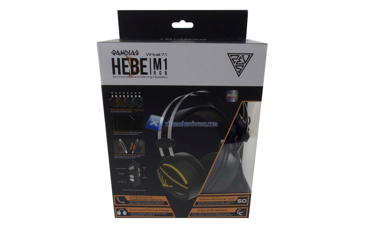 Le cuffie GAMDIAS HEBE M1 RGB le troveremo ospitate nella consueta confezione di cartone. Il design della stessa è stato aggiornato in concomitanza del rilancio e presentazione di nuovi prodotti. Non mancano tutte le principali informazioni, caratteristiche e immagini illustrative del prodotto.