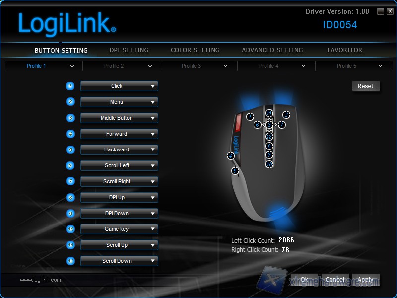 Il pannello Color Setting ci permette di modificare le impostazioni dell’illuminazione del mouse. Infatti possiamo cambiare colore ai LED scegliendo tra ben 32 colori diversi, cambiare l’intensità dell’illuminazione ed inoltre la modalità di pulsazione.