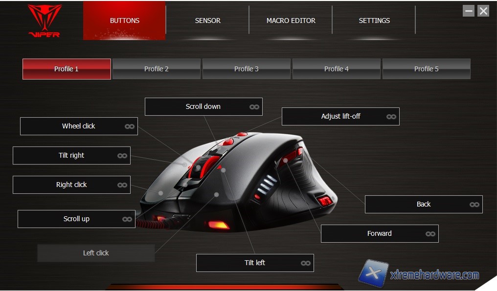 Ci troveremo di fronte una GUI molto ben curata ed ordinata nonché aggressiva come il prodotto stesso. Come altri software di gestione di periferiche da gaming anche il software di Patriot è caratterizzato da Tab/Menù con le diverse funzioni ed opzioni. Nel dettaglio abbiamo 4 Menù principali da cui potremo accedere all’assegnazione dei tasti, Macro e quant’altro.