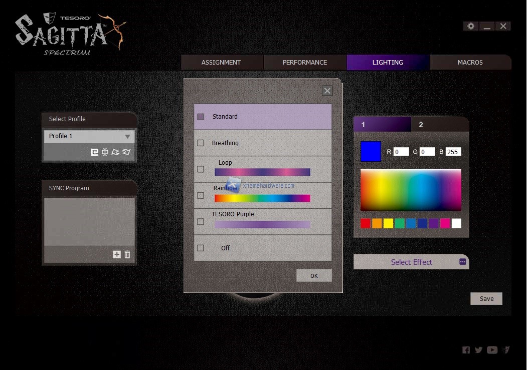 Passiamo a ‘’Lightning’’ dove potremo finalmente agire sul colore dei LED posti all’interno del mouse. Essendo il Sagitta Spectrum dotato di retroilluminazione RGB potremo impostare diversi colori nonché accedere anche a qualche effetto di retroilluminazione come ‘’Breathing’’, ‘’Loop’’, ‘’Rainbow’’ oltre al colore classico del brand il ‘’Purple’’. Inoltre il mouse è dotato di una retroilluminazione a due zone, visibile anche dalle due Tab nel Menù, che ci permetteranno di settare dunque un colore diverso per le due zone. Potremo impostare dunque l'effetto Rainbow in corrispondenza del logo del brand e un colore fisso per lo Scroll.