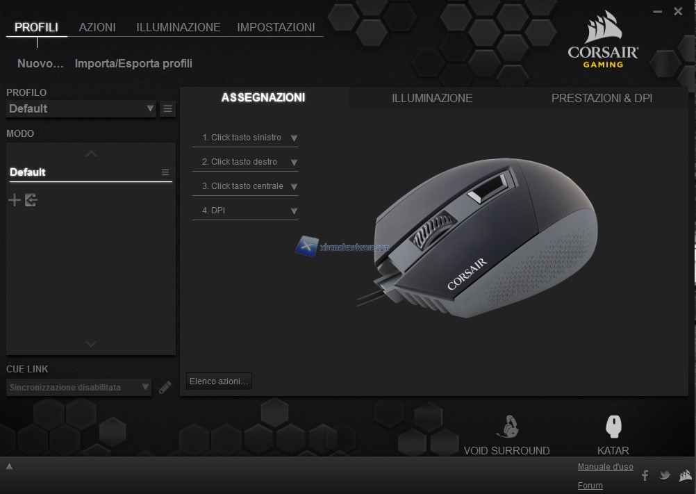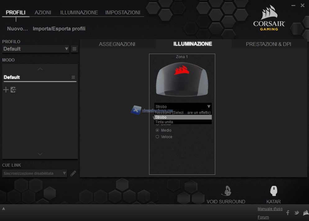 Come visto già con altri prodotti di Corsair Gaming recensiti, anche con il KATAR non è incluso alcun CD-ROM per cui dovremo collegarci al sito Corsair Gaming e prelevare il software CUE. Il Corsair Gaming KATAR di base non ha necessità di doversi o dover essere interfacciato con tale software infatti non esiste alcun link al software CUE per il KATAR. Dunque ci basterà prelevare l’ultima versione relativa alle tastiere della serie STRAFE o headset serie VOID per assicurare la rilevazione e compatibilità dello stesso.