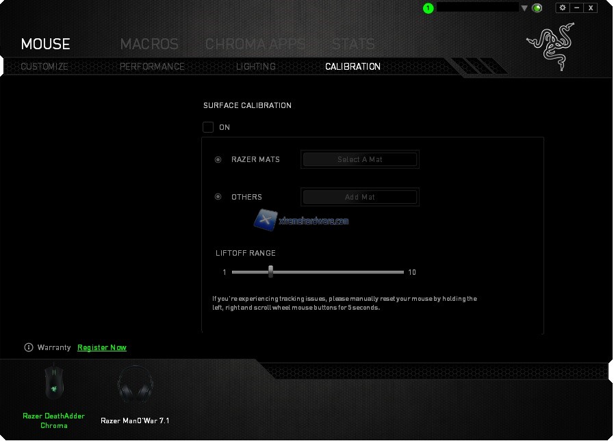 Menù ‘’Calibration’’ dove potremo impostare eseguendo il test di calibrazione per eventuali e diversi mousepad a seconda della superficie e impostare il valore di LOD da 1 a 10 per trovare il giusto compromesso.
