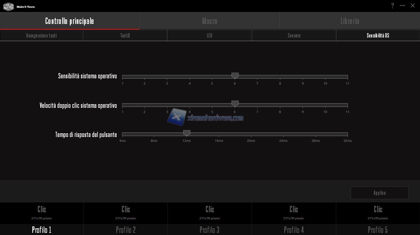Nella parte alta abbiamo tre Menù principali che sono ‘’Controllo Principale’’, ‘’Macro’’ e infine ‘’Libreria’’ mentre nella parte bassa i 5 Profili cui potremo aggiungere anche delle icone per meglio distinguere l’utilizzo. Per la voce ‘’Controllo Principale’’ troviamo cinque SottoMenù che sono ‘’Assegnazione Tasti’’, ‘’TactiX’’, ‘’LED’’, ‘’Sensore’’ e infine ‘’Sensibilità OS’’. Diamo ora una breve descrizione di ciascuno.