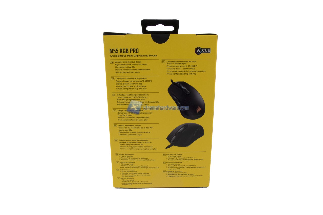 Il Corsair M55 RGB Pro giungerà nuovamente nell’ormai nota e conosciuta confezione di cartone. Confezione nella classica colorazione Giallo/Nero. La confezione riporta tutte le principali informazioni e diverse immagini illustrative del prodotto.