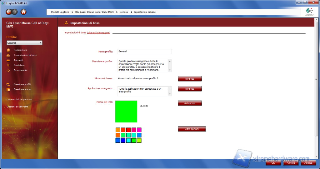Il software che usa Logitech per i suoi prodotti è Setpoint, che ci permette in modo intuitivo di modificare a piacimento le impostazioni del mouse. Aprendo il software ci troviamo di fronte la schermata principale che ci mostra tutte le periferiche che supportano questo programma. Nel nostro caso clicchiamo sull’icona del G9x.