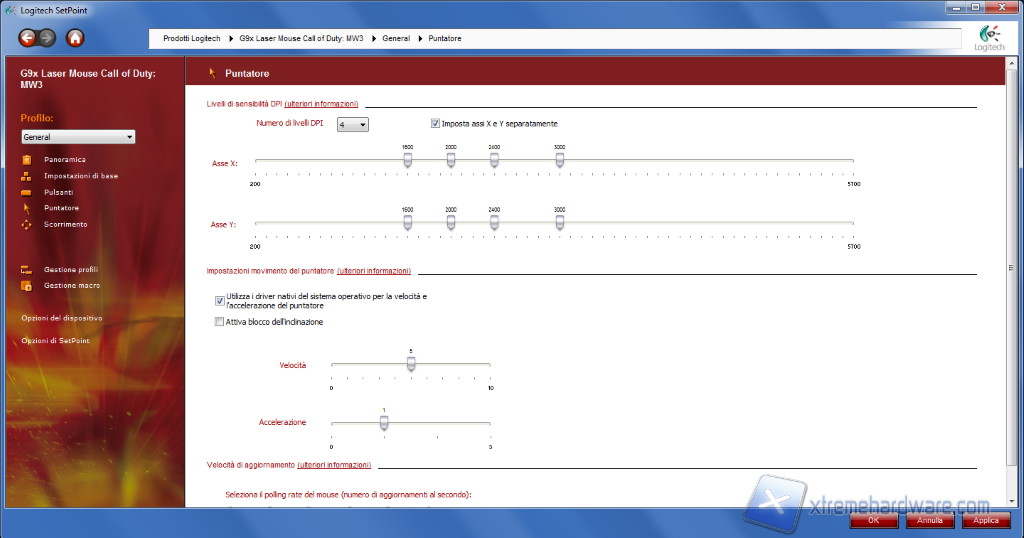 La voce “Puntatore” ci permette di impostare fino a cinque livelli di DPI, in step di 100 DPI, in modo indipendente per gli assi X e Y. Sono inoltre disponibili controlli per regolare la velocità e l’accelerazione del puntatore e la velocità di aggiornamento.