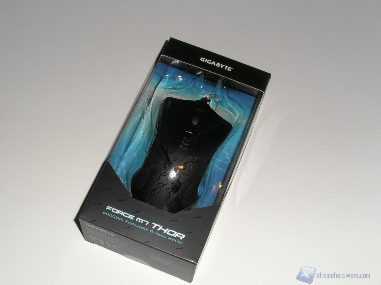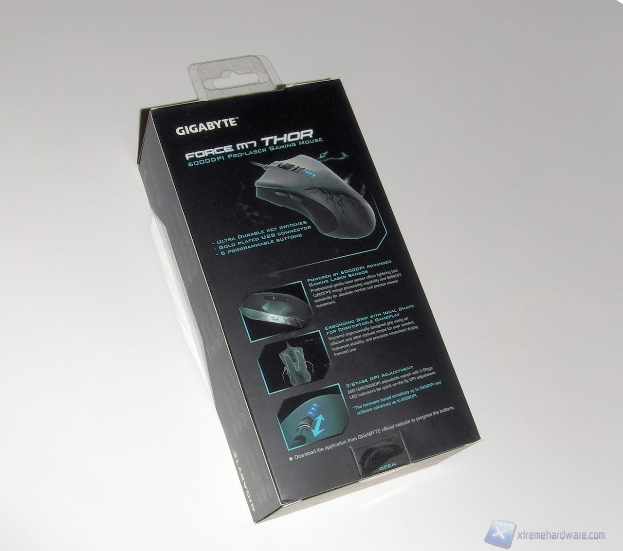 La confezione del Gigabyte Force M7 Thor è semplice e riprende lo stile adottato da molti produttori per i prodotti più disparati. La parte centrale della confezione è realizzata in plastica trasparente per permettere all'acquirente di visionarne il mouse contenuto, mentre il retro e parte dei lati sono realizzati in cartone di colore nero.