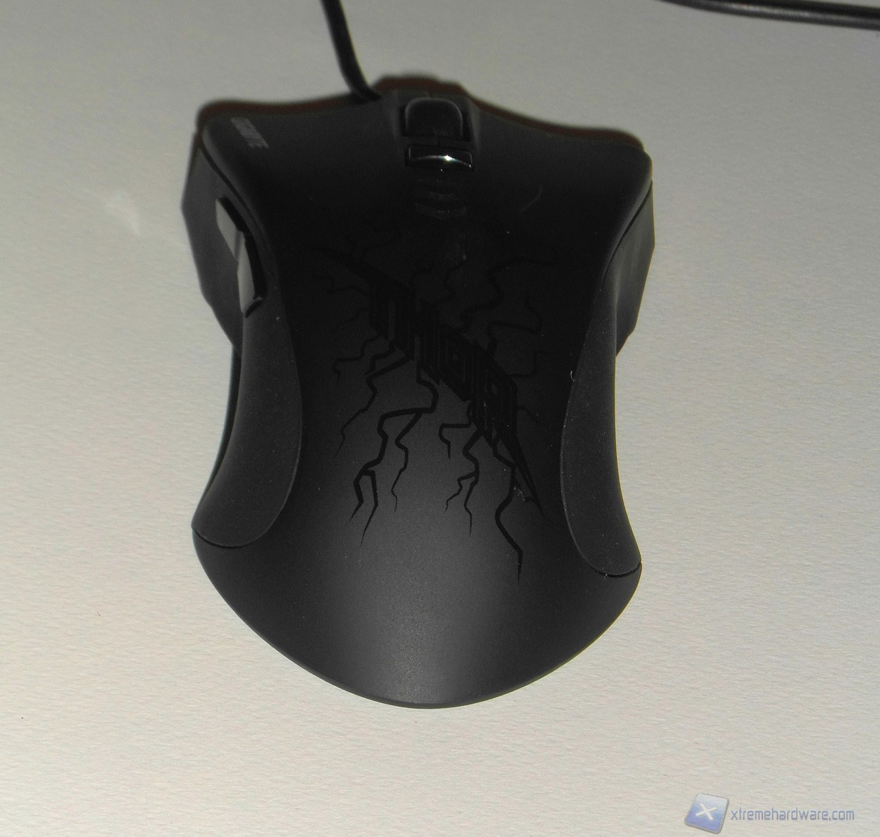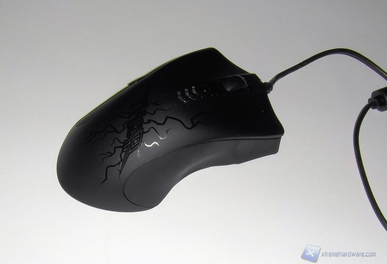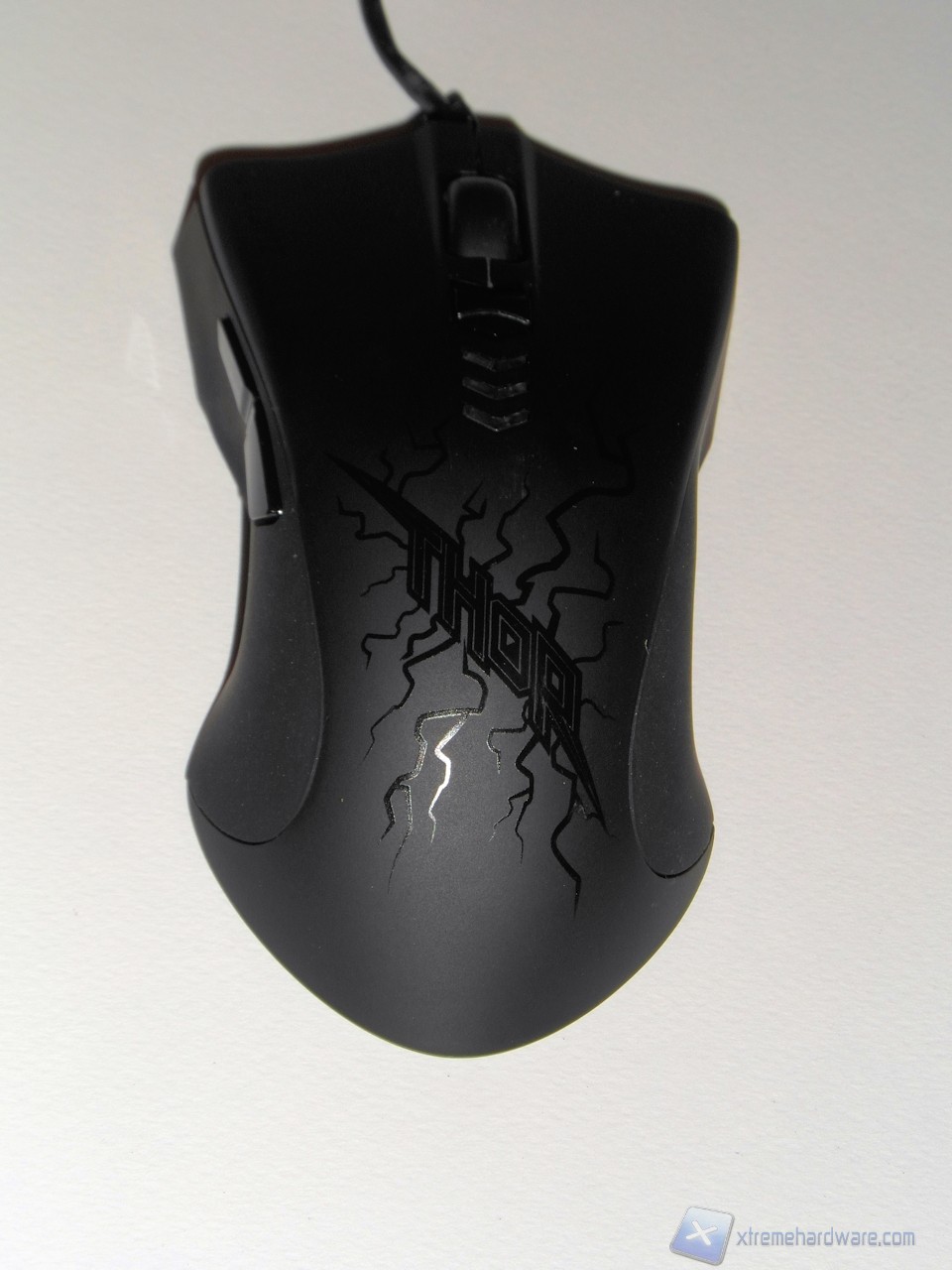 Il logo Thor, circondato da fulmini, è stampato nella parte finale della gobba del mouse. La stampa è lucida ed è in forte contrasto con la plastica opaca che lo supporta. Anche la vista posteriore non aiuta a capire la reale forma del mouse, in quanto le rientranze laterali sono decisamente marcate e “scompaiono” nel profilo.