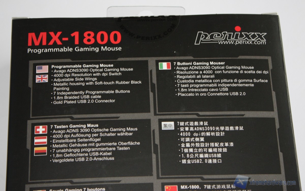 Tramite un’apertura a libro abbiamo la possibilità di visualizzare il prodotto all’interno della confezione. A lato troviamo invece un’ulteriore immagine illustrativa, in questo caso del modello in colorazione nera. Il Perixx MX-1800 è infatti disponibile in due colorazioni: nero e rosso.