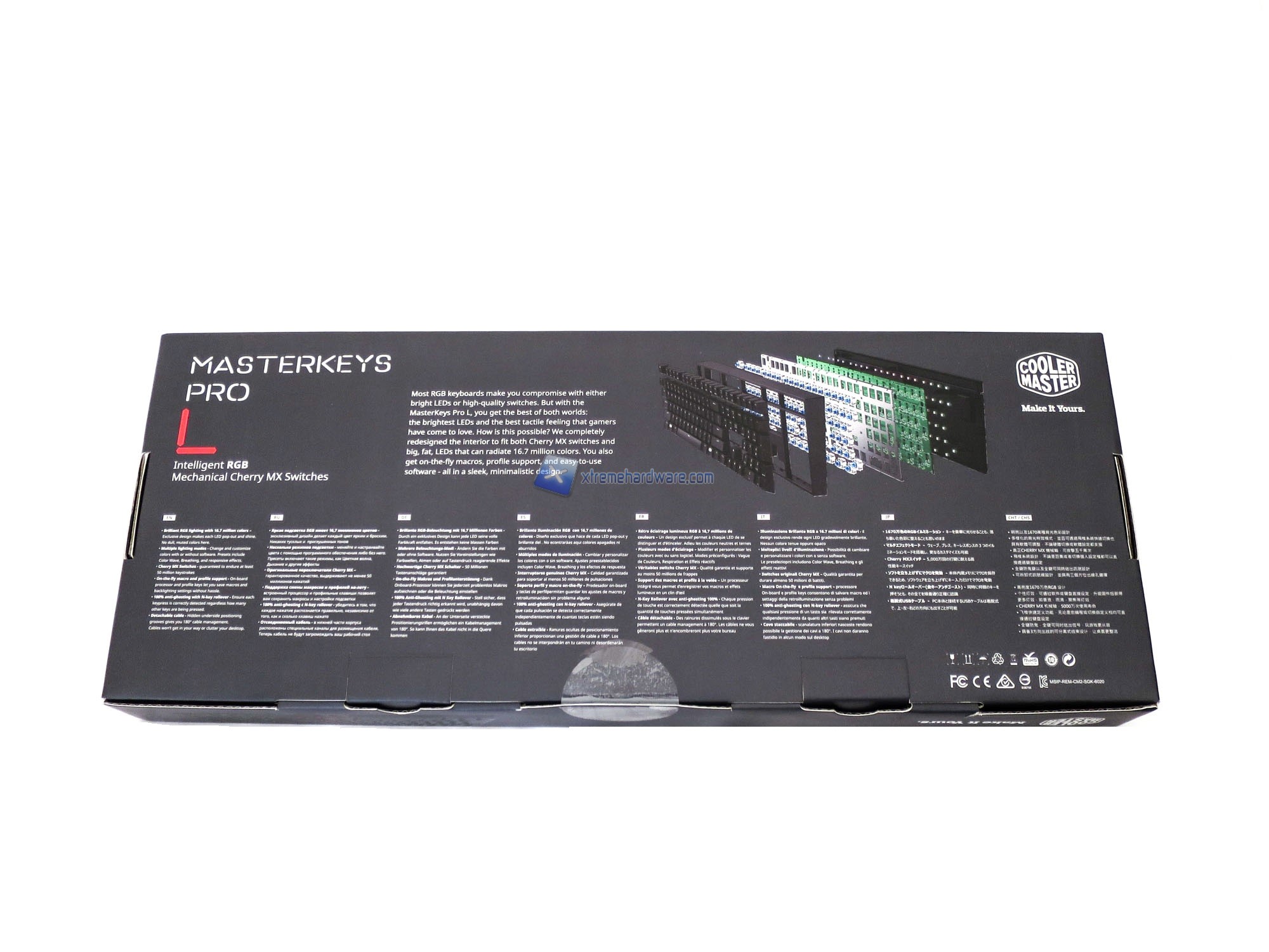 Nuova serie, nuova confezione. Cooler Master per i modelli MasterKeys Pro L e S ha scelto un nuovo layout grafico o per meglio dire ha ‘’riutilizzato’’ quello già visto con il case MasterCase 5 (QUI recensito). Quindi colorazione interamente grigia con diverse immagini illustrative del prodotto, diversi loghi a conferma delle valide caratteristiche del prodotto e diverse altre informazioni riportate in diverse lingue.