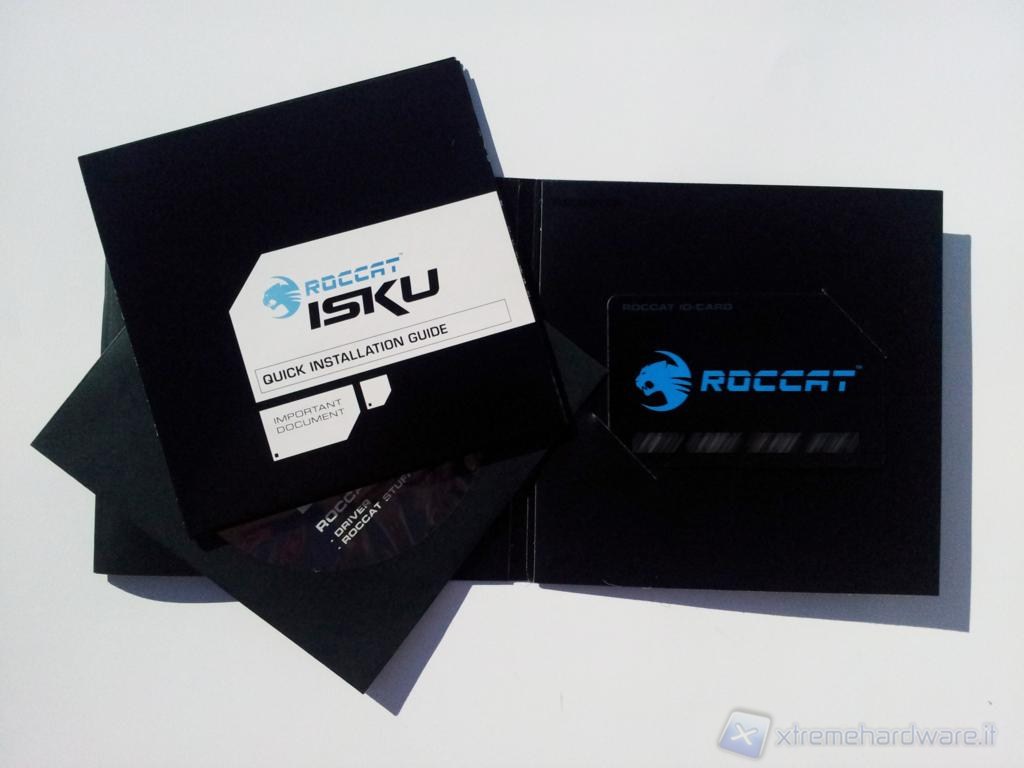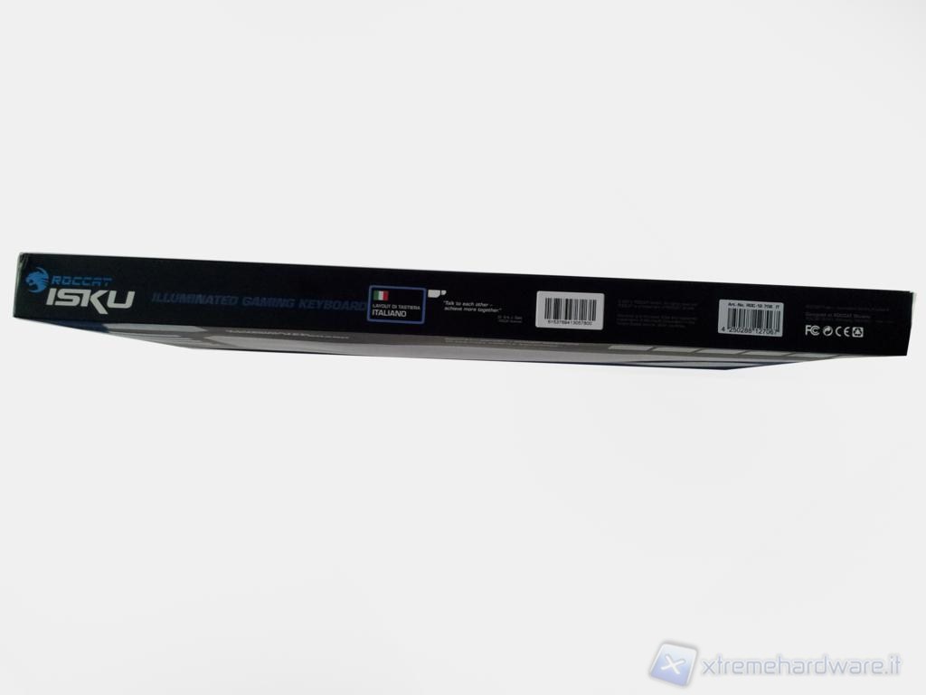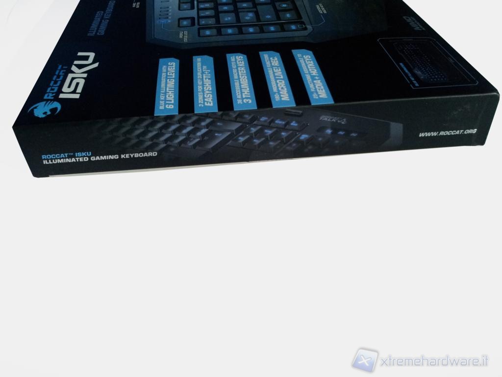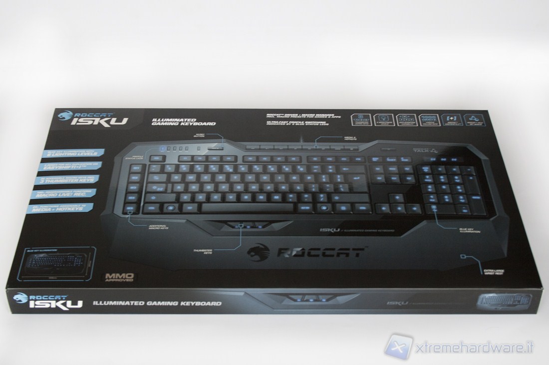 La tastiera Roccat Isku viene venduta all'interno di una confezione dalla forma rettangolare davvero imponente seppur poco spessa. Lo stile grafico utilizzato è caratterizzato da una palette di colori tipica dell'azienda che vede la predominanza di un blu elettrico su uno sfondo nero. Centralmente, nella parte frontale, spicca un'immagine quasi a dimensioni reali della tastiera con varie indicazioni inerenti le particolari features dei tasti. In alto a destra il logo Roccat con la denominazione del modello; questo è seguito dalla scritta "Illuminated Gaming Keyboard" mentre sotto è presente una lista delle features. In basso a sinistra, in un piccolo riquadro con l'immagine della tastiera, sono indicate le dimensioni della periferiche mentre in alto a destra sono presenti delle immagini e delle scritte inerenti ad altre caratteristiche tecniche della periferica.