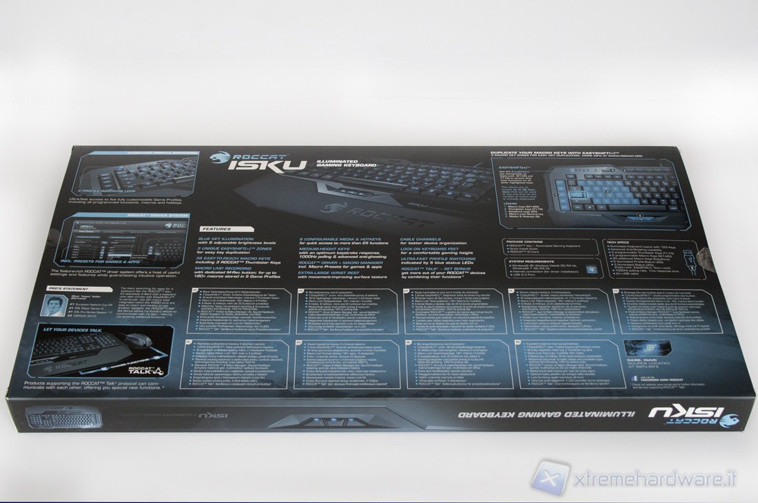 Nella parte posteriore della confezione sono presenti diverse informazioni molto dettagliate riguardanti praticamente tutte le principali features della tastiera trascritte in varie lingue; purtroppo, come per gli altri prodotti Roccat, manca l'italiano.