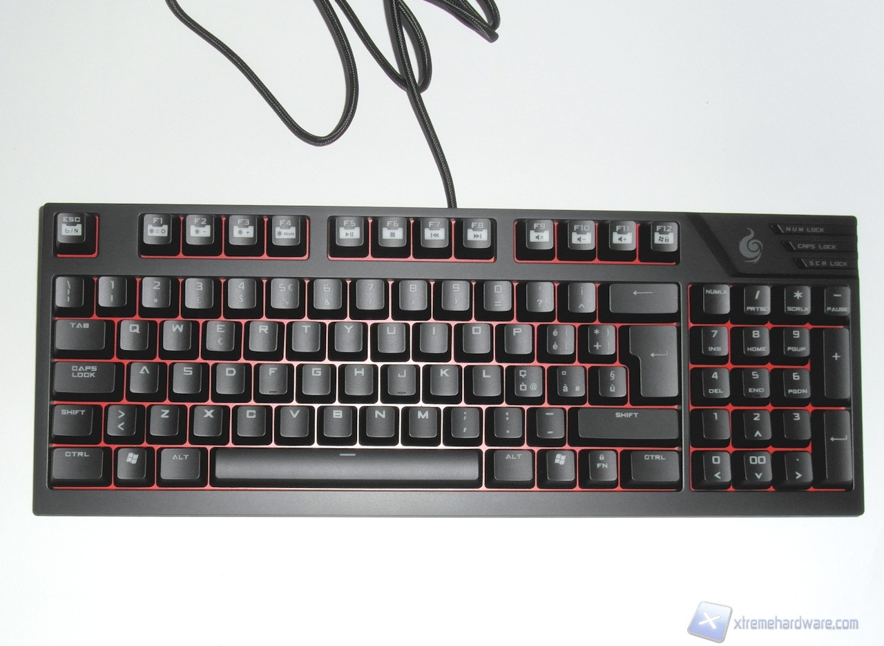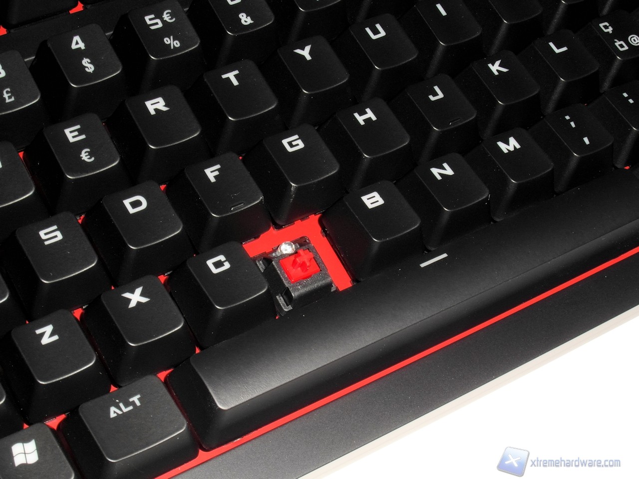Con lo strumento in dotazione è possibile rimuovere i CAP dai tasti sotto ai quali emergono gli switch Cherry MX Red dotati di LED rosso nella parte superiore.