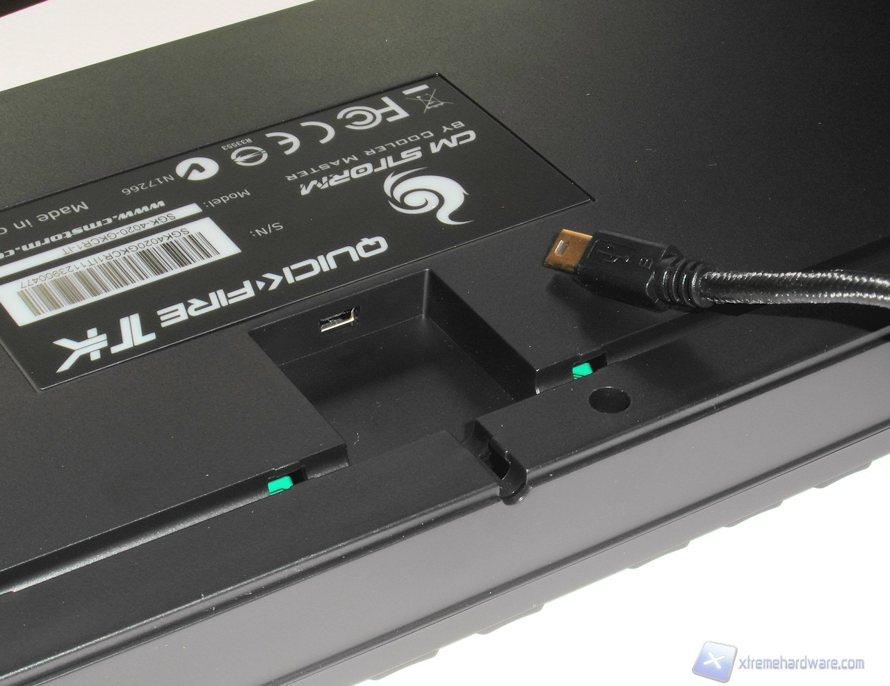Al centro il connettore mini-USB permette la connessione della tastiera al PC. Possiamo osservare che è possibile bloccare il cavo in tre direzioni, come sulla QuickFire Pro, al fine di posizionarlo come meglio ci aggrada.