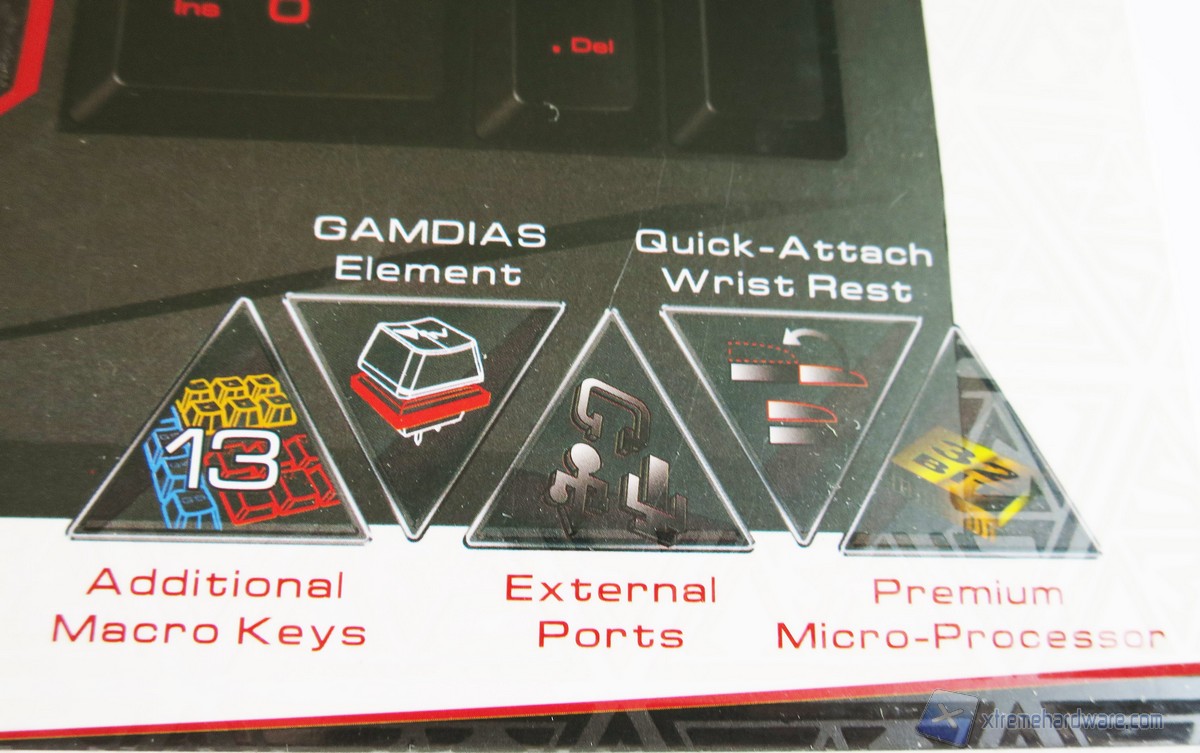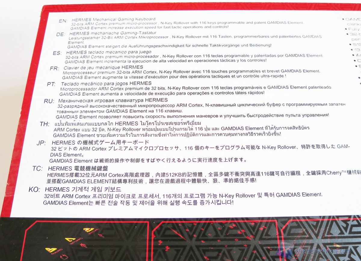 Nel retro della confezione troviamo invece alcune informazioni riportate in varie lingue (tra cui manca l’italiano) oltre ad altre caratteristiche tecniche ed un’immagine illustrativa che completa la grafica. Non manca l’informazione che ci ricorda il tipo di Layout (non e` presente il Layout ITA) e Switch utilizzati. Purtroppo non è al momento disponibile un layout ITA.