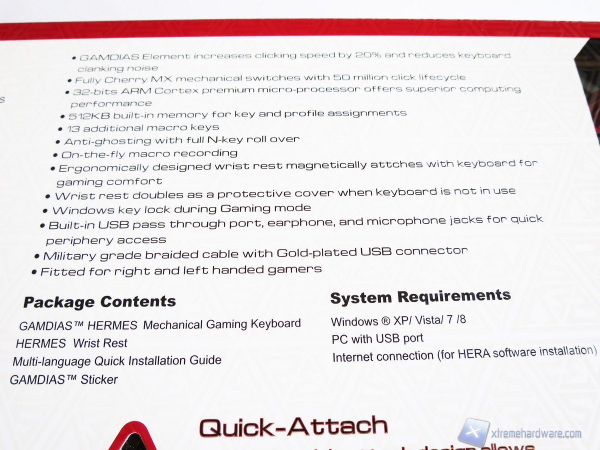 La confezione della GAMDIAS Hermes Ultimate è imponente sia dal piano di informazioni riportate su di essa che per il peso e la grandezza. Nella parte frontale troviamo il logo del brand, il modello della tastiera e un’immagine illustrativa che copre tutta la parte frontale della scatola. Inoltre è presente un’apertura trasparente in corrispondenza delle freccette direzionali abbinate a due tasti macro che vedremo nel corso di questa recensione. Non mancano alcune caratteristiche interessanti di questa tastiera meccanica riportate agli angoli quali una retroilluminazione a sei livelli, una memoria onboard da 512KB oltre a ben 13 tasti Macro programmabili.