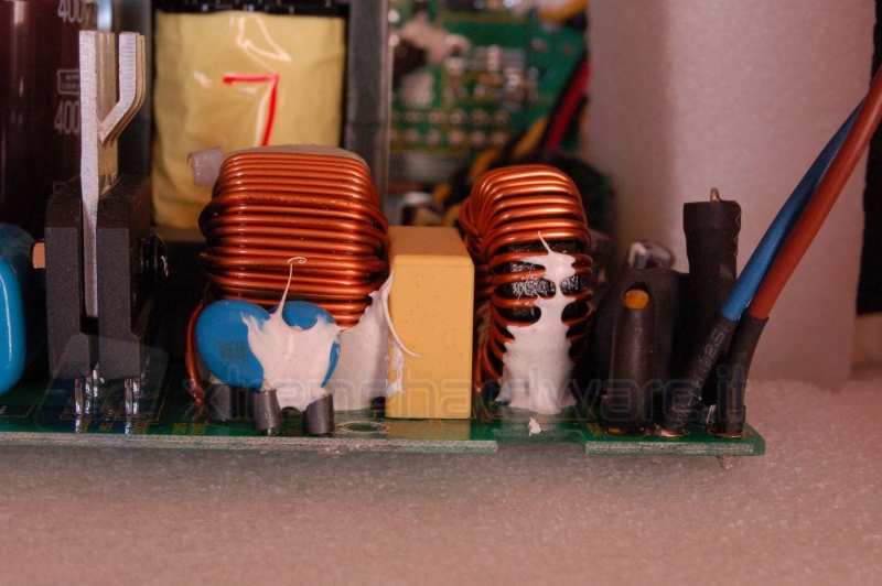 A seguire intravediamo un MOV (varistore in ossido di metallo o resistore variabile, di colore blu nascosto dietro i ponti rettificatori) il cui compito è quello di attenuare, scaricando a massa, eventuali ed indesiderati transienti di tensioni elevate. Per terminare la sezione di filtro possiamo infine notare una speciale bobina con una intelaiatura in ferrite a mò di trasformatore, atta a renderla ancora più efficiente e resistente nel tempo.