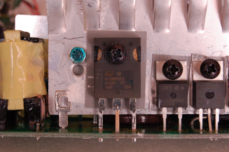 La sezione del raddrizzatore di rete, unitamente al PFC, è ultimata da tre MOSFET di potenza INFINEON 20N60C3 e da un ulteriore diodo CSD06060 di produzione CREE (il primo a sx), uno schottky in carburo di silicio. I quattro componenti sono disposti nella consueta configurazione a ponte di Graetz, ed è tramite questa circuitazione che il segnale bipolare originato dalla corrente alternata di rete viene trasformato in un’unica polarità (dai ponti rettificatori) e quindi modificato in una doppia semi-onda (dal ponte di diodi), in modo tale da risultare più facilmente utilizzabile, cioè filtrabile e spianabile, nei successivi stadi di switching.