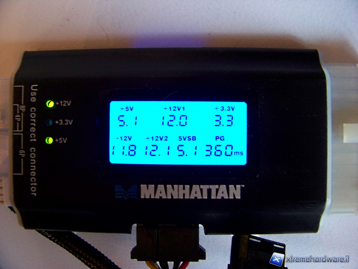 Il test è stato effettuando utilizzando un tester per alimentatori prodotti da Manhattan, azienda produttrice di periferiche e accessori per personal computer fondata nel 1987.