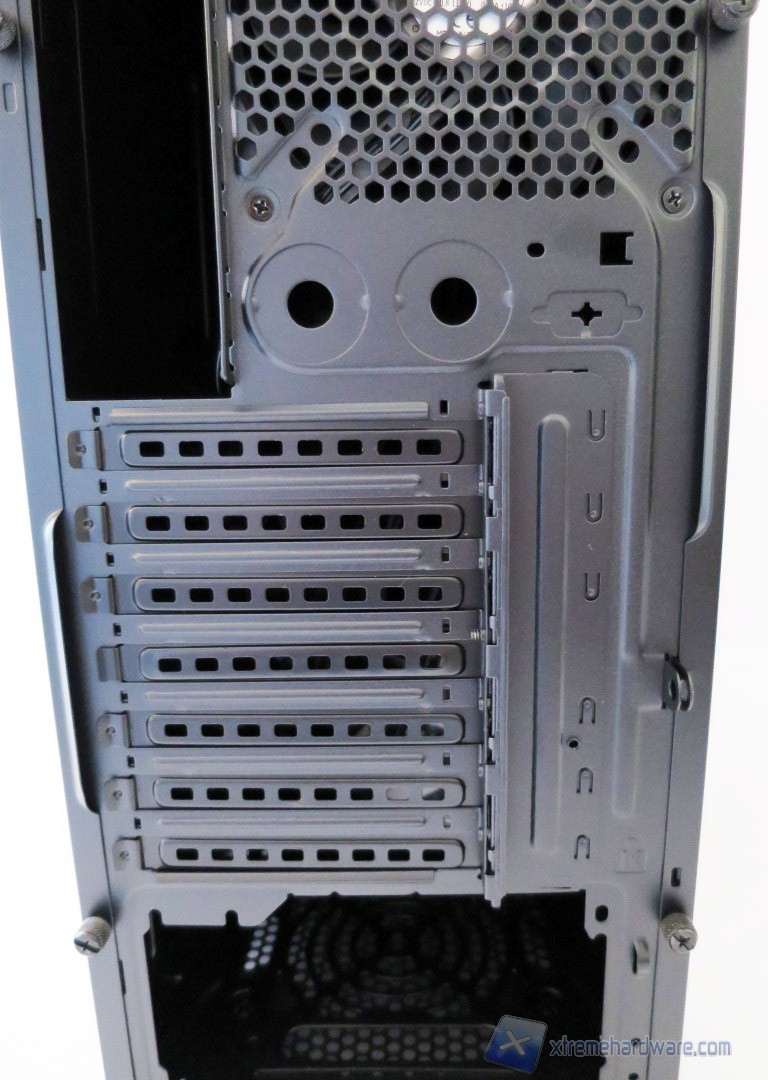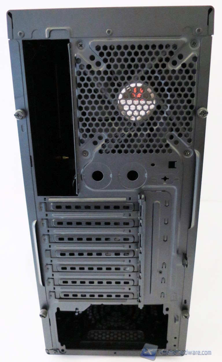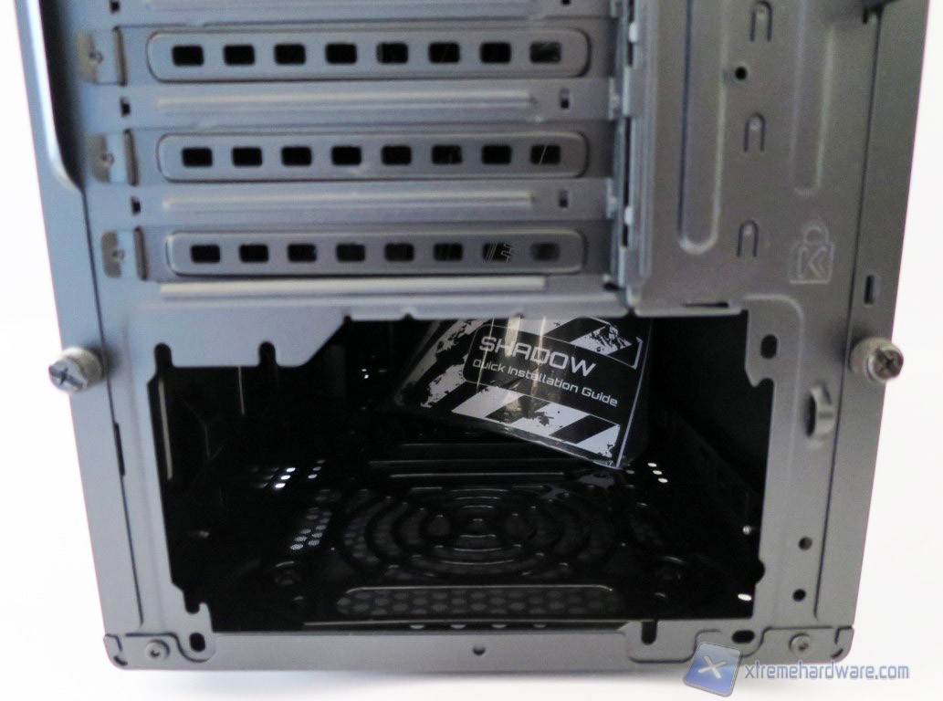 Il retro del BitFenix Shadow ha una disposizione classica con l’alimentatore nella parte bassa del case e la scheda madre nella parte alta. Nel dettaglio, troviamo partendo dall’alto la griglia per la ventola da 120 millimetri (pre-installata) con a lato il foro per l’installazione della mascherina I/O della scheda madre e poco più sotto due fori, non gommati, per il passaggio di tubi per un eventuale impianto a liquido. Facciamo una piccola precisazione che riguarda appunto l’impianto a liquido. Come per Il BitFenix Neos anche il BitFenix Shadow seppur dotato di tali fori per un’installazione esterna di radiatori non permette viste le dimensioni interne di montare un impianto a liquido. Unica soluzione se si volesse utilizzare il BitFenix Shadow con una configurazione a liquido sarebbe quella di realizzare una waterstation esterna in cui tutti i componenti principali sono appunto montati esternamente ma a nostro avviso tale case non è adatto neanche in questa configurazione ipotetica. Detto questo procediamo nell’analisi della parte posteriore. Sotto i due fori troviamo 7 slot. In questo caso si è scelto di utilizzare slot PCI perforati quindi potrebbe essere presente il fenomeno del “negative loop” orizzontale, tale per cui le temperature della scheda grafica possono aumentare a causa del potenziale ricircolo di aria calda dall’esterno. Ciò si verifica quando c’è un fenomeno di pressione negativa, ovvero sbilanciamento tra ventole in estrazione e in immissione, in favore delle prime. I 7 slot sono inoltre tenuti saldamente nella parte terminale da una cover in metallo con relativa vite nel mezzo. Per finire troviamo il foro per l’installazione di un alimentatore ATX.
