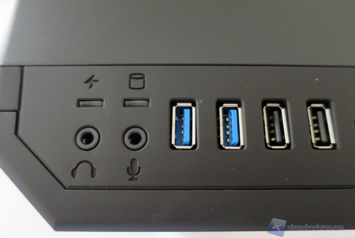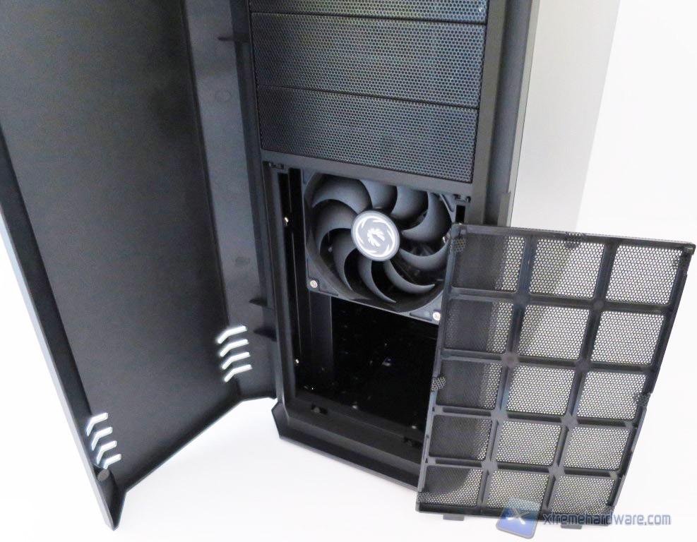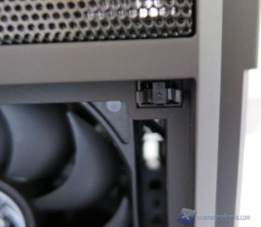 Il frontale del BitFenix Shadow è rivestito di una superfice Soft Touch molto bella al tatto ed alla vista. Spostandoci leggermente verso il basso possiamo notare il classico logo BitFenix in risalto ed ai lati alcune feritoie che sembrano le branchie di uno squalo, questo per rendere più aggressivo ma non meno elegante il BitFenix Shadow. La loro funzione principale è permettere il passaggio di aria fresca alle retrostanti ventole da 120mm. Il colore del frontale è completamente nero opaco, come per molti altri case dell’azienda taiwanese. Notiamo inoltre come il pannello frontale sia solo una semplice protezione per le unità da 5,25 pollici e per la griglia delle ventole: infatti, ci basterà aprire lo sportello/pannello per accedere al vero frontale composto da una griglia a più inserti per l’installazione di unità da 5,25 pollici. Tali griglie sono dotate di comodi filtri antipolvere. La griglia inferiore, dotata di filtro antipolvere in spugna per due ventole da 120mmm, si rimuove con due semplici click, premendo semplicemente verso l’interno. Questo perché la griglia è dotata di due fermi agganciati a due supporti nella parte interna del case. La rimozione e la pulizia del filtro è pertanto molto semplice. Dietro tale griglia si cela la ventola da 120 millimetri preinstallata ed è possibile montare un’ulteriore ventola, sempre da 120 millimetri. Analizzando la parte top/frontale troviamo le connessioni USB ed i vari pulsanti. Nel dettaglio troviamo partendo da sinistra le spie attività del PC e del nostro Hard Disk, due porte USB 3.0, due porte USB 2.0, il tasto per cambiare colore ai LED, il tasto per spegnere l’illuminazione a LED, il classico tasto per l’accensione e per finire quello del Reset. La parte superiore del BitFenix Shadow, invece, non presente aperture o griglie per l’installazione di radiatori o ventole aggiuntive nella parte alta del case.