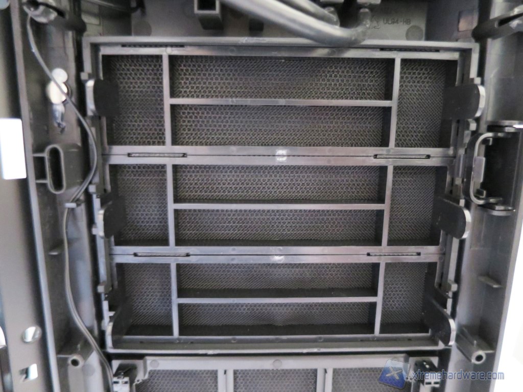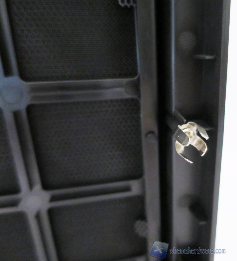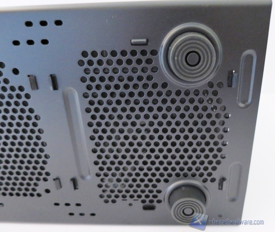 La paratia inferiore del BitFenix Shadow è semplice e non presenta features particolari se non per i due filtri antipolvere interni (che vedremo nel dettaglio nei prossimi capitoli) in corrispondenza della ventola dell’alimentatore. Il filtro è facilmente removibile e lavabile in modo da averlo sempre pulito e assicurare sempre il miglior ricircolo d’aria. Il BitFenix Shadow è dotato inoltre di classici piedini in plastica con una buona altezza tale da consentire un flusso d’aria nella parte bassa del case quando lo avremo appoggiato sulla scrivania o per terra.
