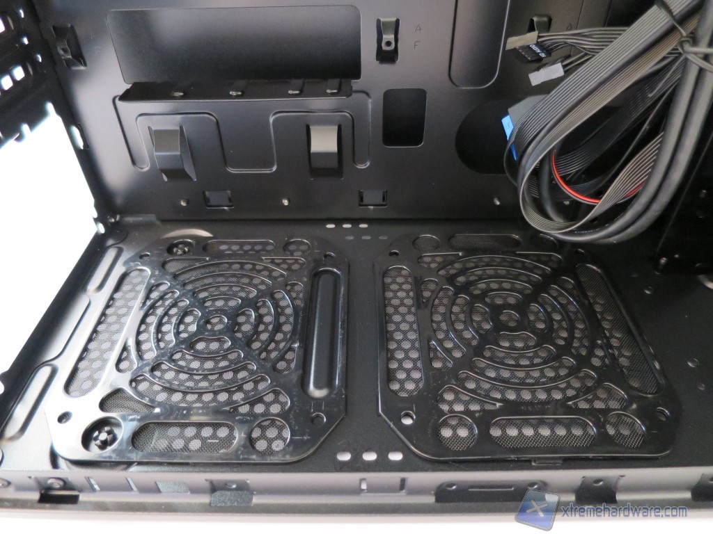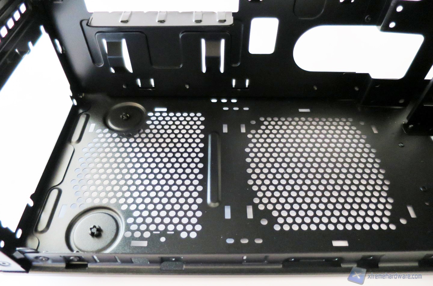Il BitFenix Shadow di base non permette l’installazione di sistemi a liquido esterni o interni complessi in quando non presenta un adeguato spazio per configurazioni composte da pompa, radiatore etc. E’ dotato di fori passatubi, ma data la tipologia di case vi sconsigliamo di realizzare waterstation esterne. Unica scelta possibile sarebbe quella di utilizzare un sistema AIO da 120 da posizionare nella parte posteriore in configurazione singola o Push-Pull. Nella parte superiore non sono presenti fori o predisposizioni per eventuali ventole che crediamo BitFenix abbia risolto optando per la predisposizione frontale di due ventole da 120 millimetri. Il BitFenix Shadow avendo un po’ più di spazio interno rispetto ad altri case dello stesso brand potrebbe permettere l’installazione di un sistema SLI o Crossfire pur sempre non esagerando vista la poca espandibilità per una gestione ottimizzata della dissipazione.