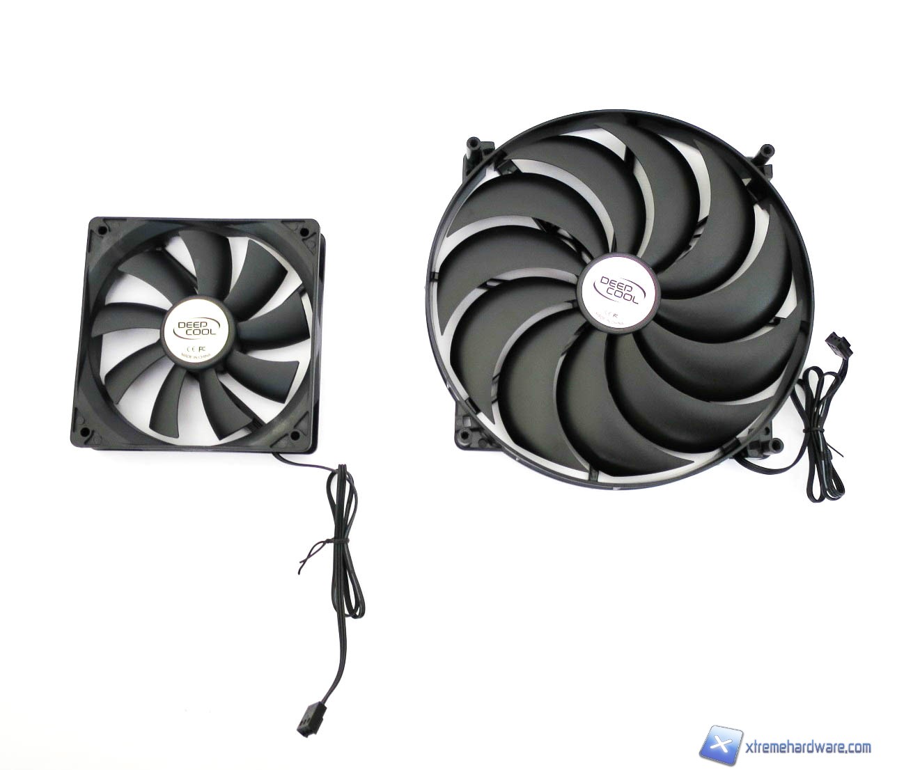 Le ventole in dotazione rispettivamente da 200 millimetri e 120 millimetri non avevano un adesivo che identificasse le specifiche tecniche per cui non possiamo procedere ad elencarvele. Unica analisi può essere fatta sull’aspetto esteriore. Entrambe sono di colore nero, la ventola da 120 millimetri presenta un design classico sia per quanto riguarda il frame che per le pale. Queste sono in totale 9. Passando alla ventola da 200 millimetri, troviamo un design più particolare con pale che presentano una leggera curvatura per migliorare il flusso generato. La ventola da 200 mm si compone invece di 11 pale ed anche in questo caso non abbiamo informazioni se non i due adesivi con il brand DeepCool. I connettori per entrambe le ventole sono i classici a 3 pin.