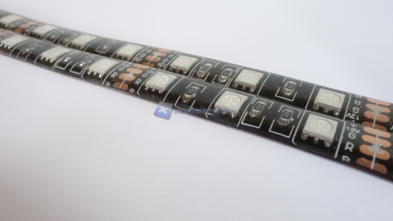 La confezione dei led contiene un paio di strisce da 30cm ciascuna, ogni striscia è caratterizzata dalla presenza di 18 led ed un lato adesivo; importante notare che le strisce sono certificate IP65. C'è poi un alimentatore con connettore molex di dimensioni molto contenute e quindi facilmente posizionabile in qualsiasi case, un ulteriore cavetto di alimentazione ausiliario ed un telecomando. Il bundle contiene pertanto tutto ciò che è necessario per utilizzare al meglio questi led. La qualità del telecomando purtroppo non è alta, diciamo piuttosto il minimo sindacale. Per quanto riguarda i connettori di alimentazione si nota che non sono realizzati con enorme precisione, l'accoppiamento m-f non è sempre perfetto risultando a volte un po' lasco.