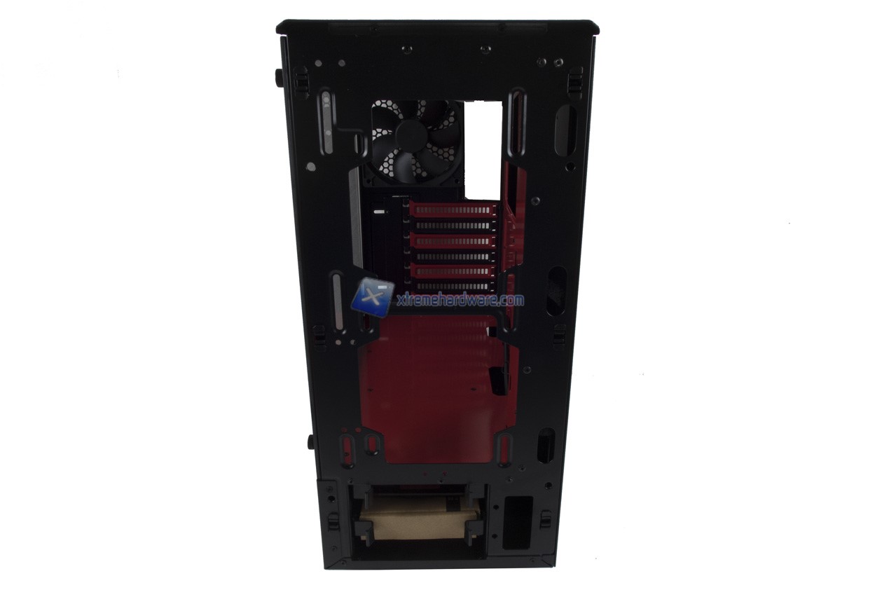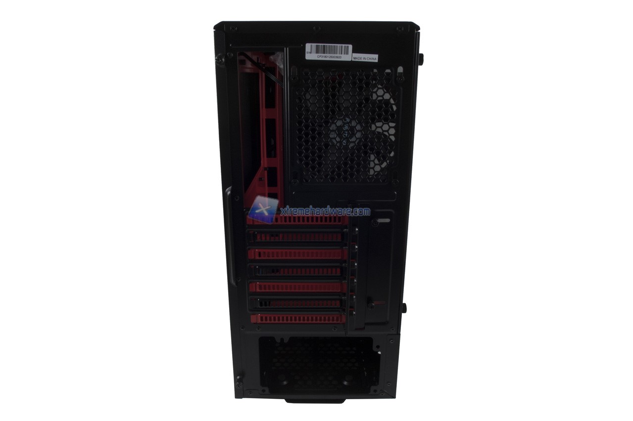 Arriviamo così al lato posteriore dove immancabile è il layout. Foro I/O Shield con a lato griglia con singola ventola da 120 mm preinstallata. A seguire ci sono 7 slot PCI-E (bicolore) e infine il foro per l’alimentatore.
