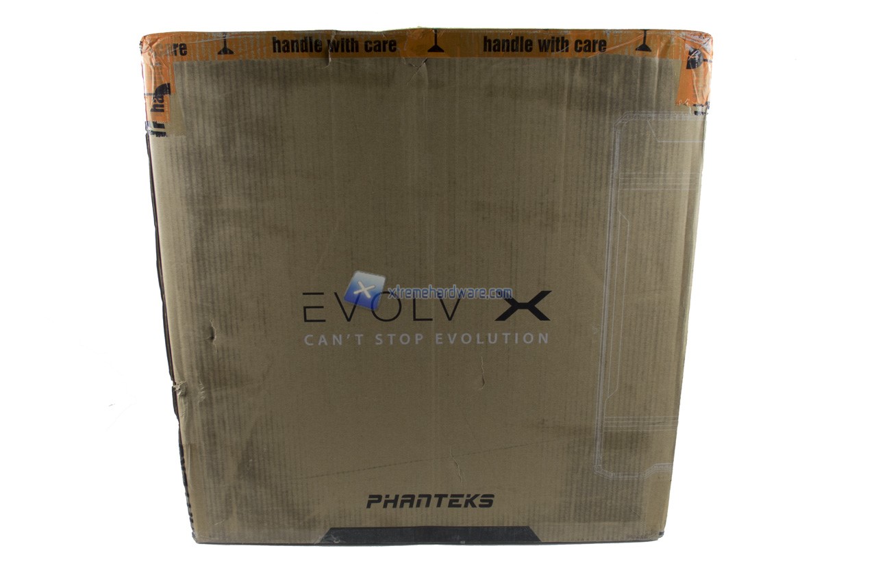 Il Phanteks Enthoo Evolv X giunge in una generosa confezione di cartone abbastanza robusta. Le dimensioni del packaging rendono già l’idea del prodotto contenuto all’interno. Le informazioni riportate sulla confezione sono essenziali.
