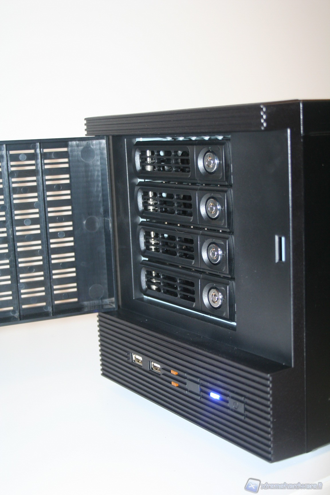 Per prima cosa dovrete smontare le due paratie laterali; fatto questo bisognerà posizionare la mascherina posteriore della scheda madre, e poi quest’ultima sulla base, per poi avvitare tramite un cacciavite con testina corta. Fatto questo sarà necessario inserire gli hard disk, avvitarli lateralmente e serrarli in posizione, processo facilissimo, sebbene però ci sia un minuscolo inconveniente ovvero che una serie di viti sono bloccate dal sistema di ritenzione in plastica laterale. Problema irrilevante, in quanto ci sono moltissimi fori di bloccaggio, ben 10 in linea teorica. Nota molto positiva : il sistema di alimentazione degli hard disk è integrato e già connesso all’alimentatore. Di una praticità impressionante, e faciliterà di molto le operazioni. Fatto questo, e montato eventualmente anche l’SSD, si potrà procedere all’installazione della scheda video (se presente) che però deve essere single slot - smontando prima i bracket di ritenzione del case, tramite l’apposito meccanismo- ; terminata questa procedura si procederà all’assemblaggio delle paratie di protezione laterali. Una procedura molto facile quindi, non dovrete preoccuparvi. Ovviamente fate attenzione a stendere il consueto velo di pasta termica tra la CPU, sempre se la soluzione non è integrata, e la base del dissipatore, oltre a connettere tutti i vari cavi di alimentazione dedicati, compresi quelli degli hard disk. Riportiamo alcune fotografie a lavoro terminato :