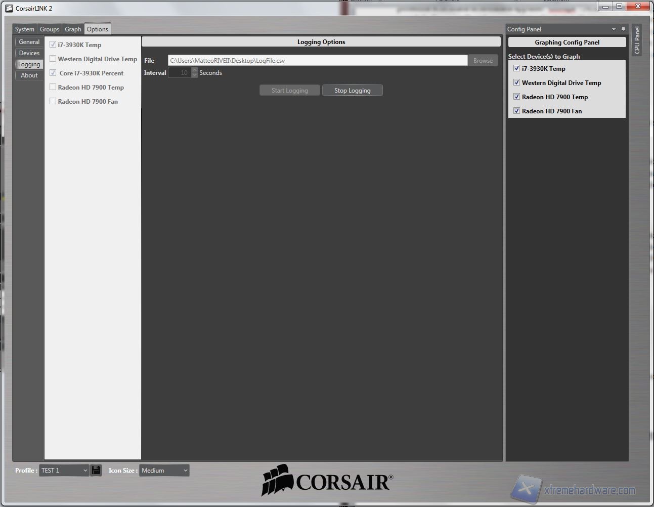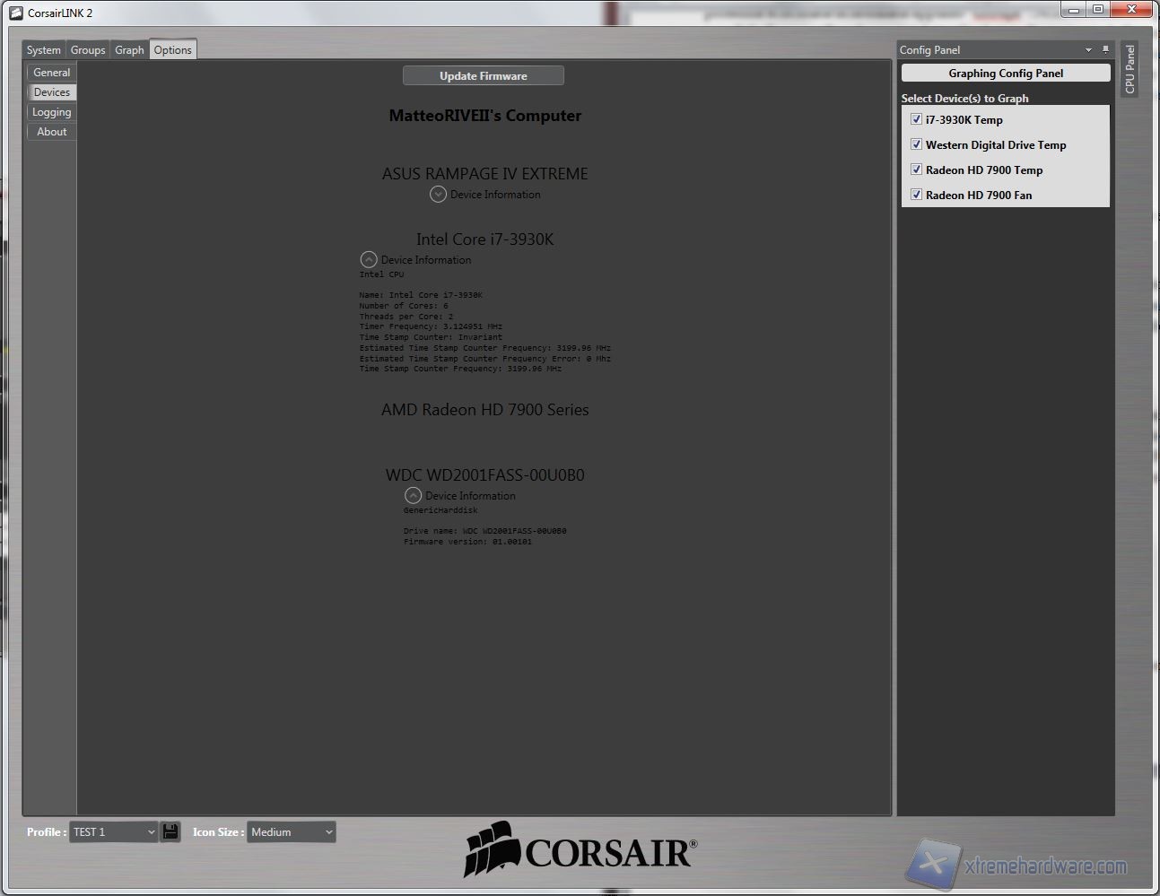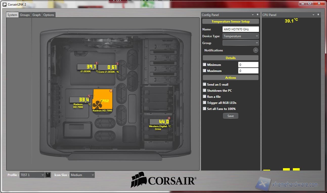 System: da qui potrete osservare direttamente sullo schermo le temperature, ripartire con delle icone che possono essere spostate e posizionate sopra le componenti. Sono disponibili diversi sfondi, raffiguranti cabinet Corsair, ma possono essere importate immagini personali, come vedrete a breve. Da qui, cliccando su ogni icona, è possibile selezionare molti parametri; un particolare degno di nota, oltre alla presenza di diversi profili customizzabili (ad esempio “Silence” o “Turbo”), è la possibilità di settare diverse icone, e quindi componenti, all’interno di gruppi, come vedremo nella prossima schermata denominata appunto “Groups”. Nella seconda fotografia potete osservare che è possibile fissare sulla schermata i dettagli relativi alle opzioni ed alla temperatura e l’utilizzo in % della CPU. Facciamo notare che la temperatura della CPU corrisponde a quella massima rilevata da Coretemp mentre quella della GPU è relativa al “GPU Core”, rilevabile da GPU-Z. Senza scendere in inutili dettagli, è particolarmente lampante il loro utilizzo quindi vi mostriamo direttamente le fotografie: