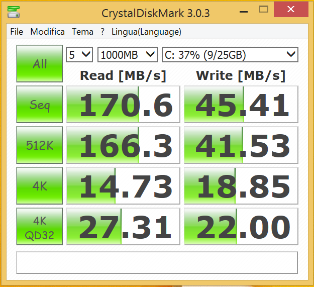 Non c'è nulla di meglio di qualche benchmark per testare le prestazioni di questo piccolo e interessante oggettino. Di seguito trovate gli screenshot dei risultati ottenuti da alcuni popolari software per il benchmarking, in particolare Cinebench, 7zip, WinRAR, GeekBench, GFXBench, Peacekeeper, Crystaldiskmark e HD Tune. Si tratta di benchmark che consentono di farsi un'idea indicativa delle prestazioni massime raggiungibili da questo microPC sia da un punto di vista della pura capacità di calcolo della CPU Intel sia per quanto riguarda la velocità della memoria interna da 32GB.